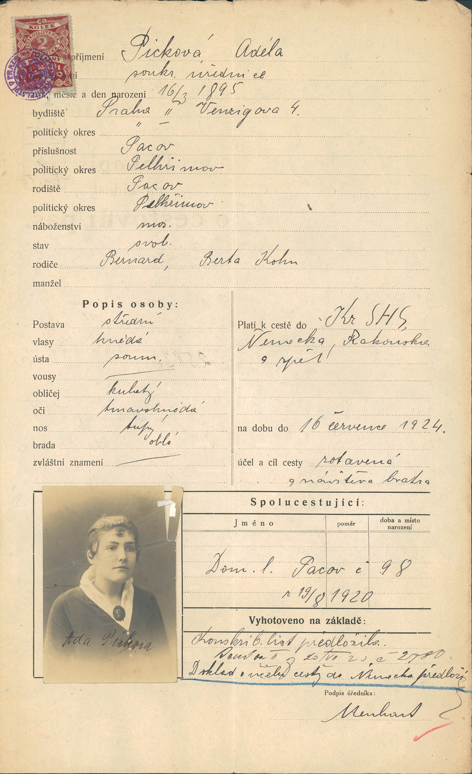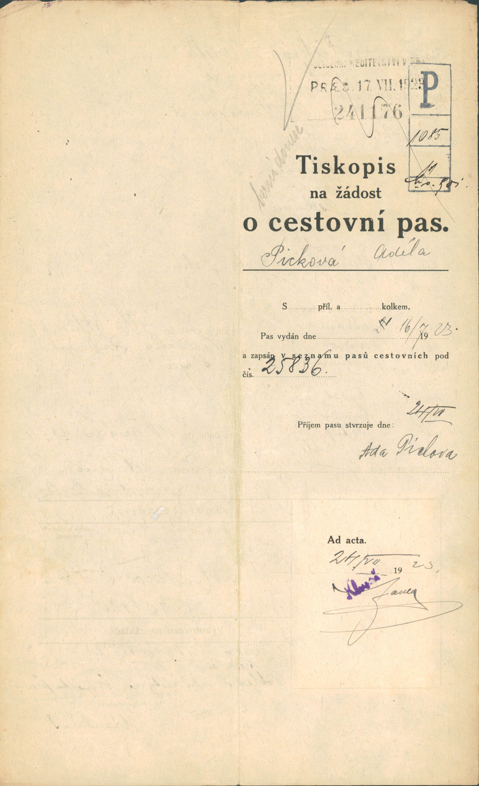 Picková Adéla: Žádost o vydání cestovního pasu