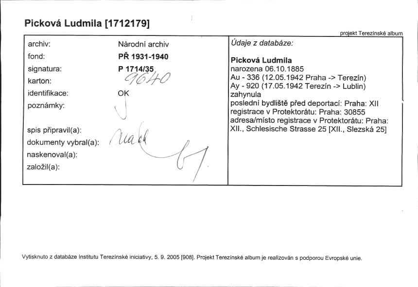 This database contains the names and fates of those who were deported from the territory of today’s Czech Republic, be it their homeland or may they have been deported to the Theresienstadt ghetto before from different european countries. Further, it contains basic information on those men, women and children, most of whom were Roma or Sinti, who died as prisoners of the so-called „Gypsy camp I“ Lety u Písku.