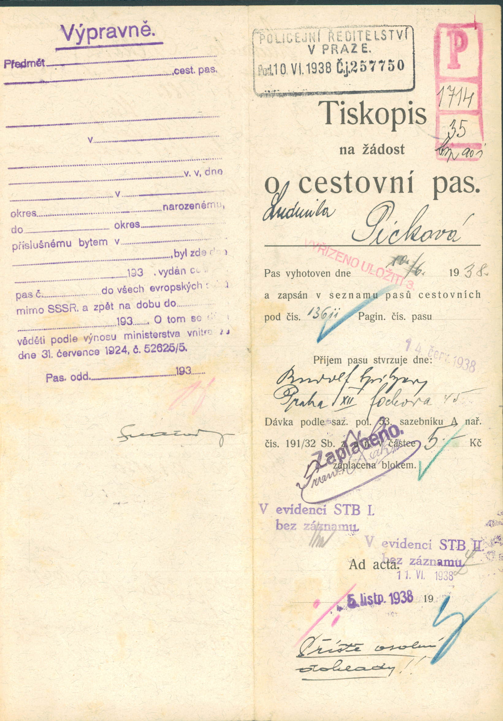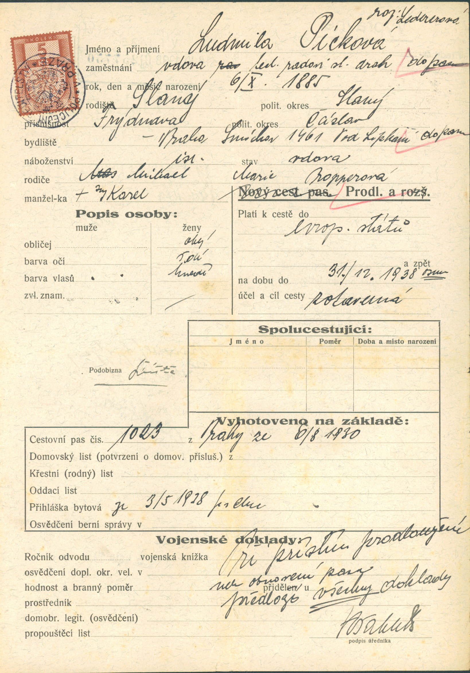 Picková Ludmila: Žádost o prodloužení a rozšíření cestovního pasu