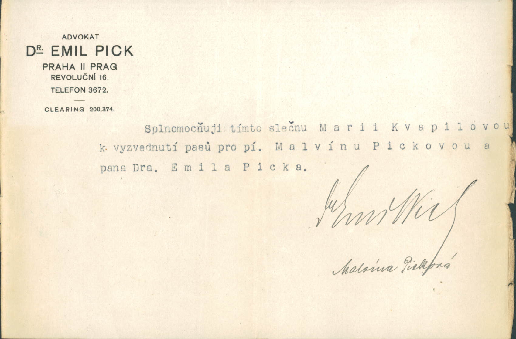 Picková Malvína: Plná moc k vyzvednutí cestovního pasu