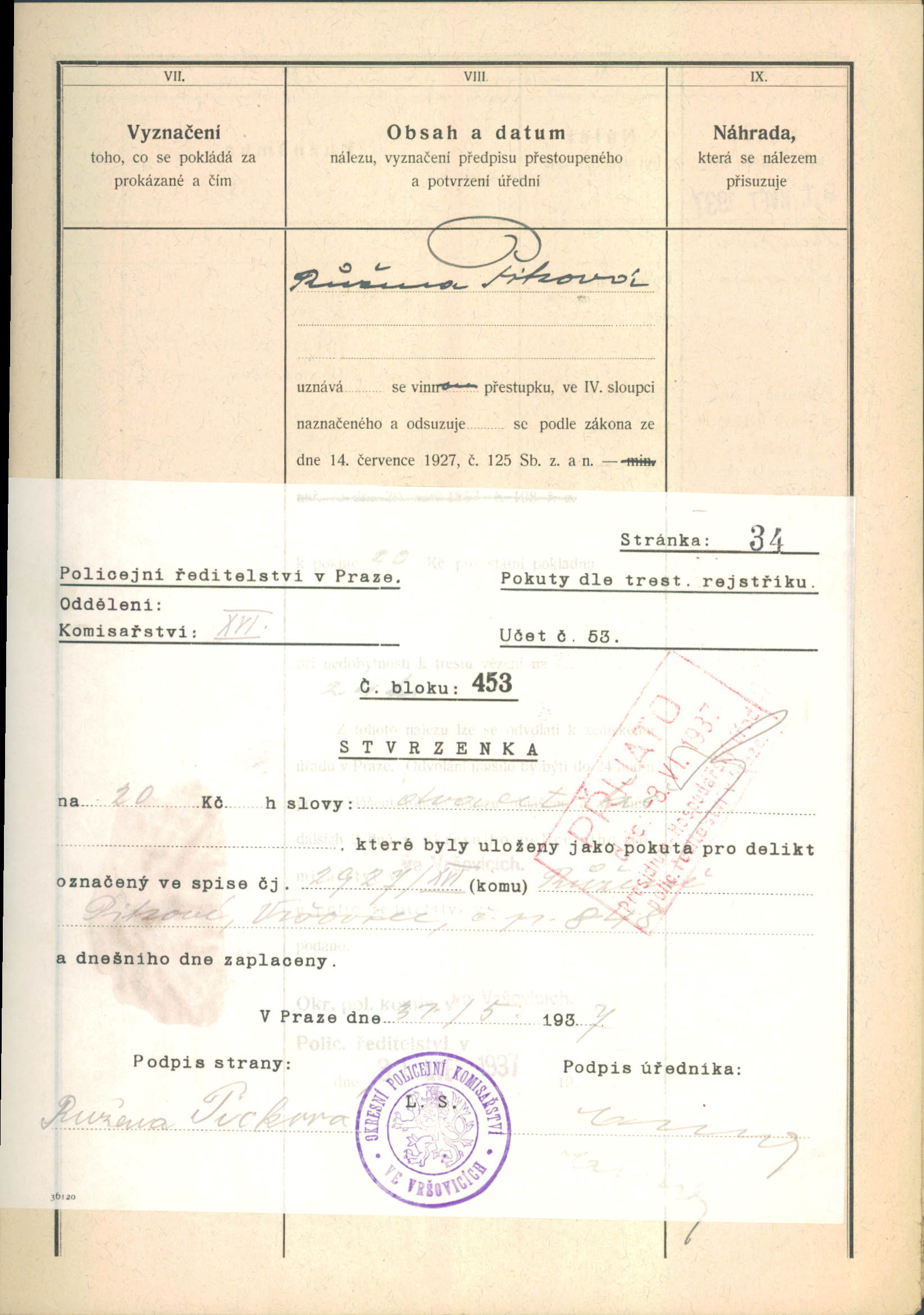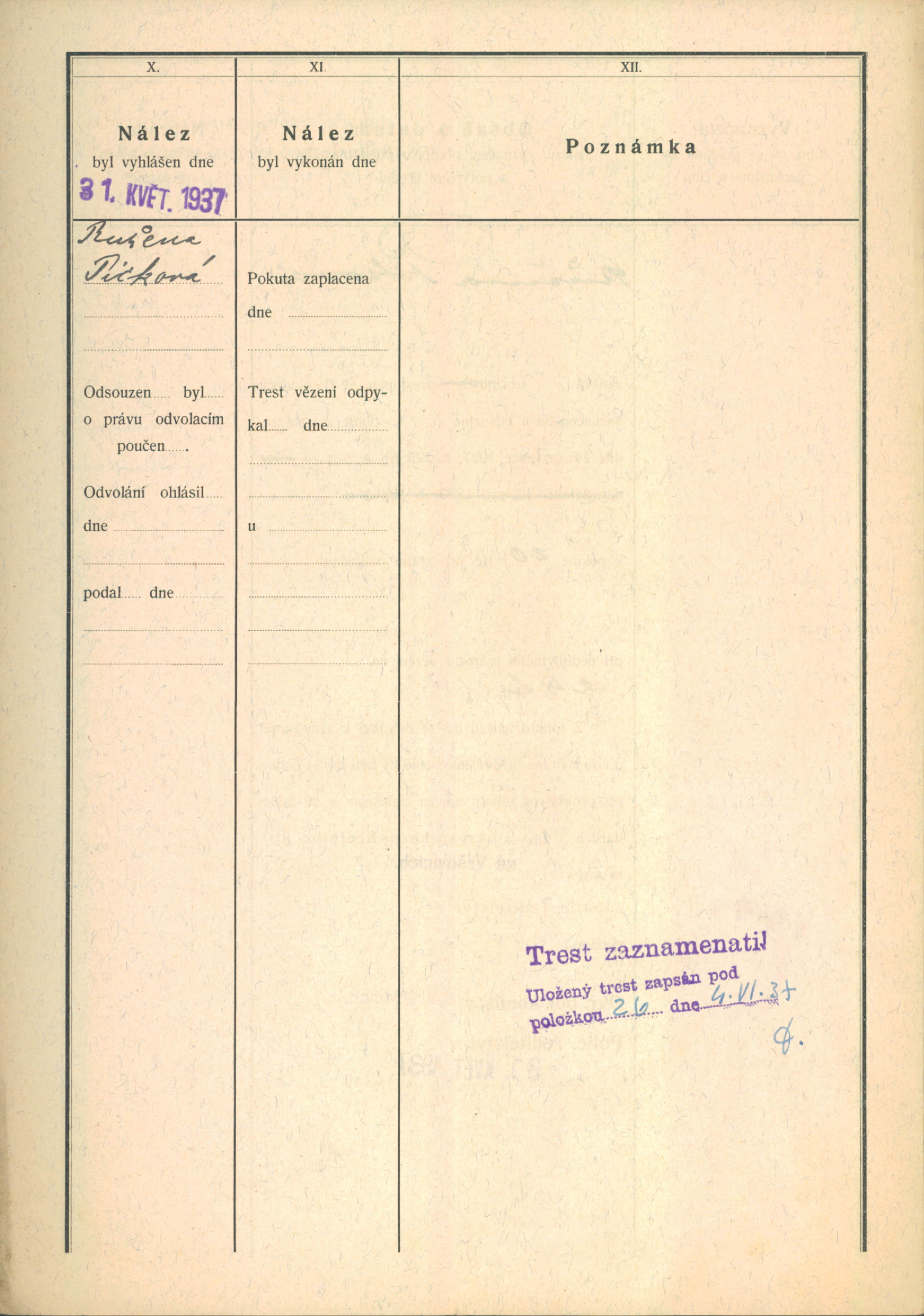 Picková Růžena: Protokol o výslechu