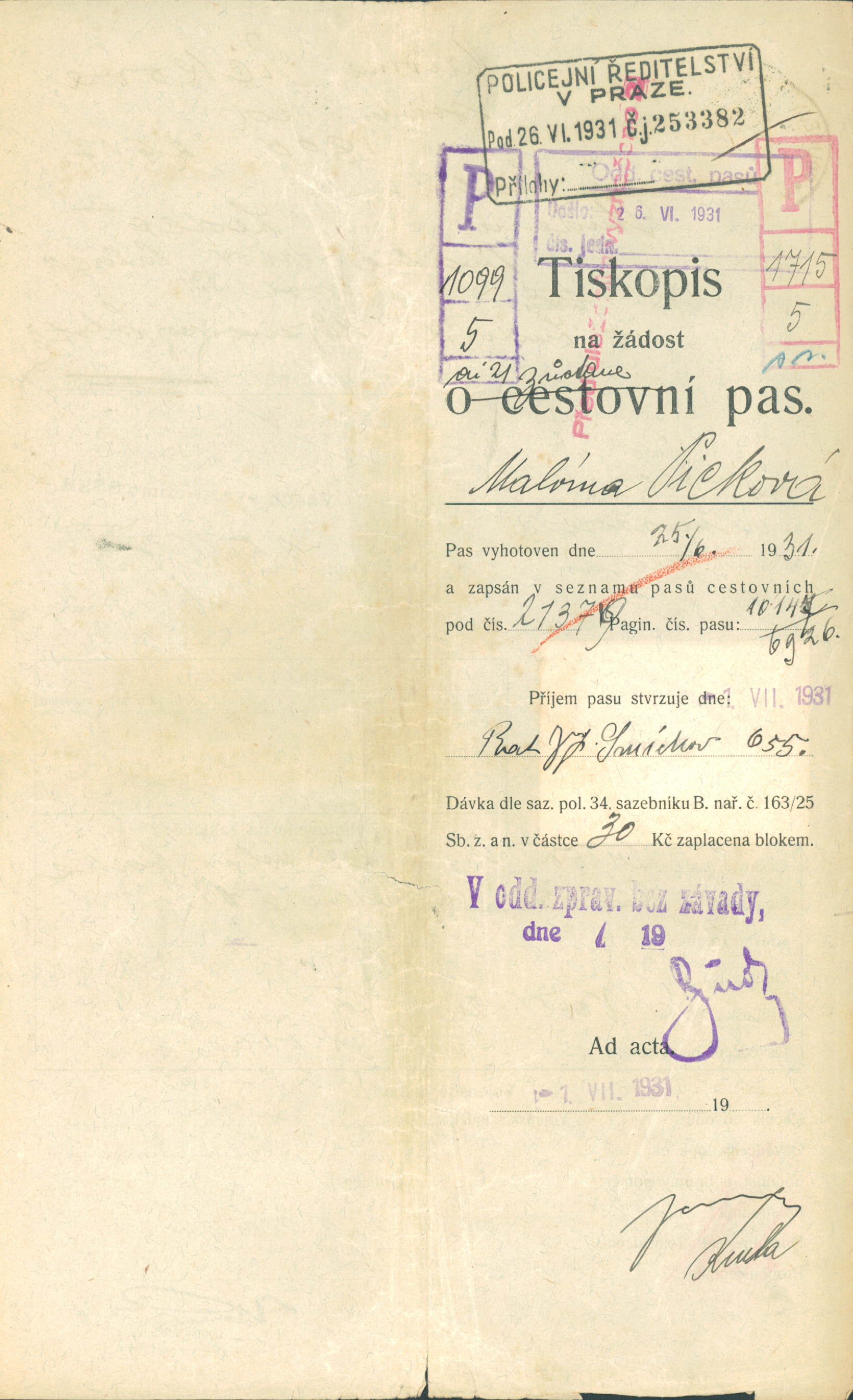 Picková Malvína: Žádost o vydání cestovního pasu
