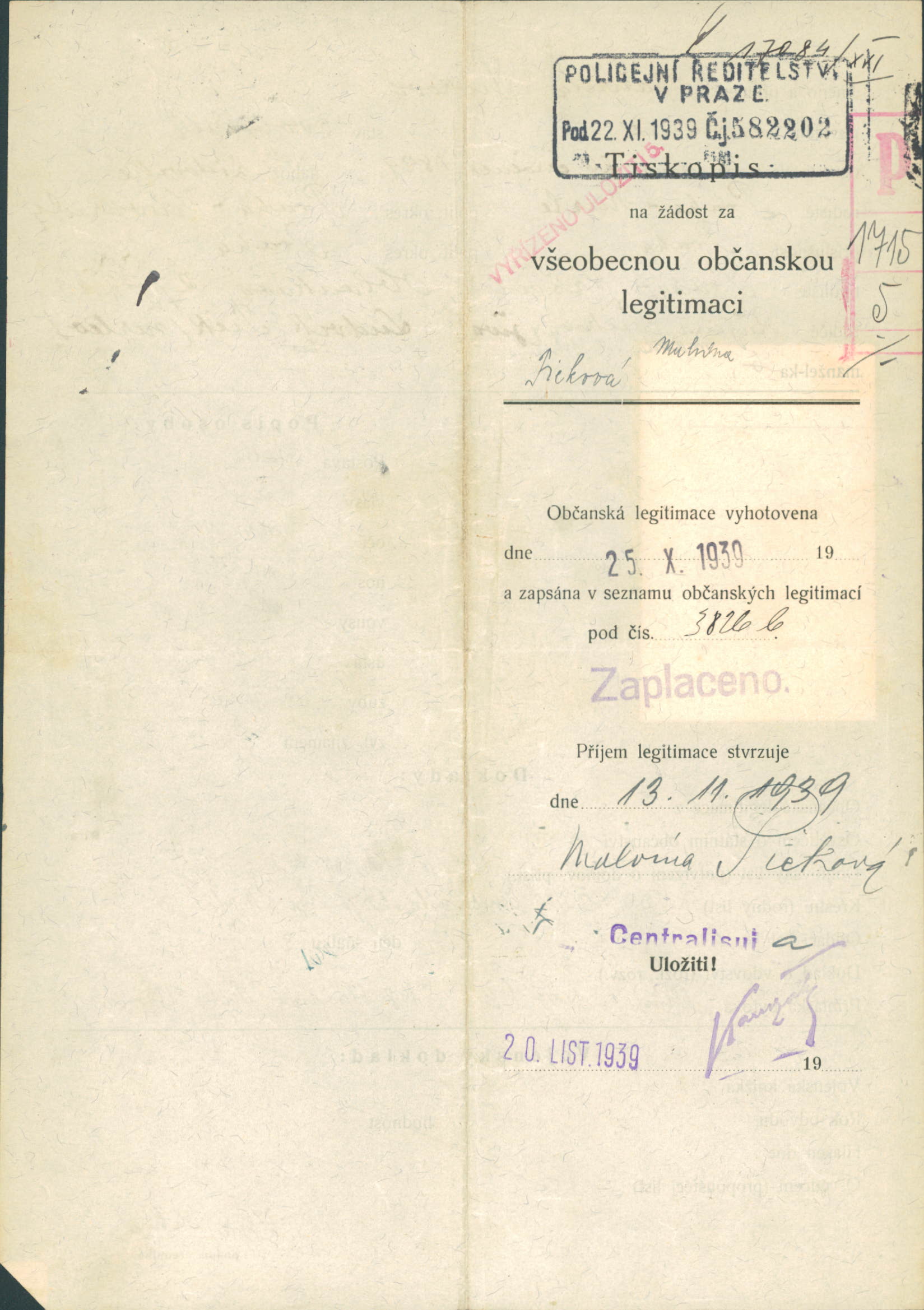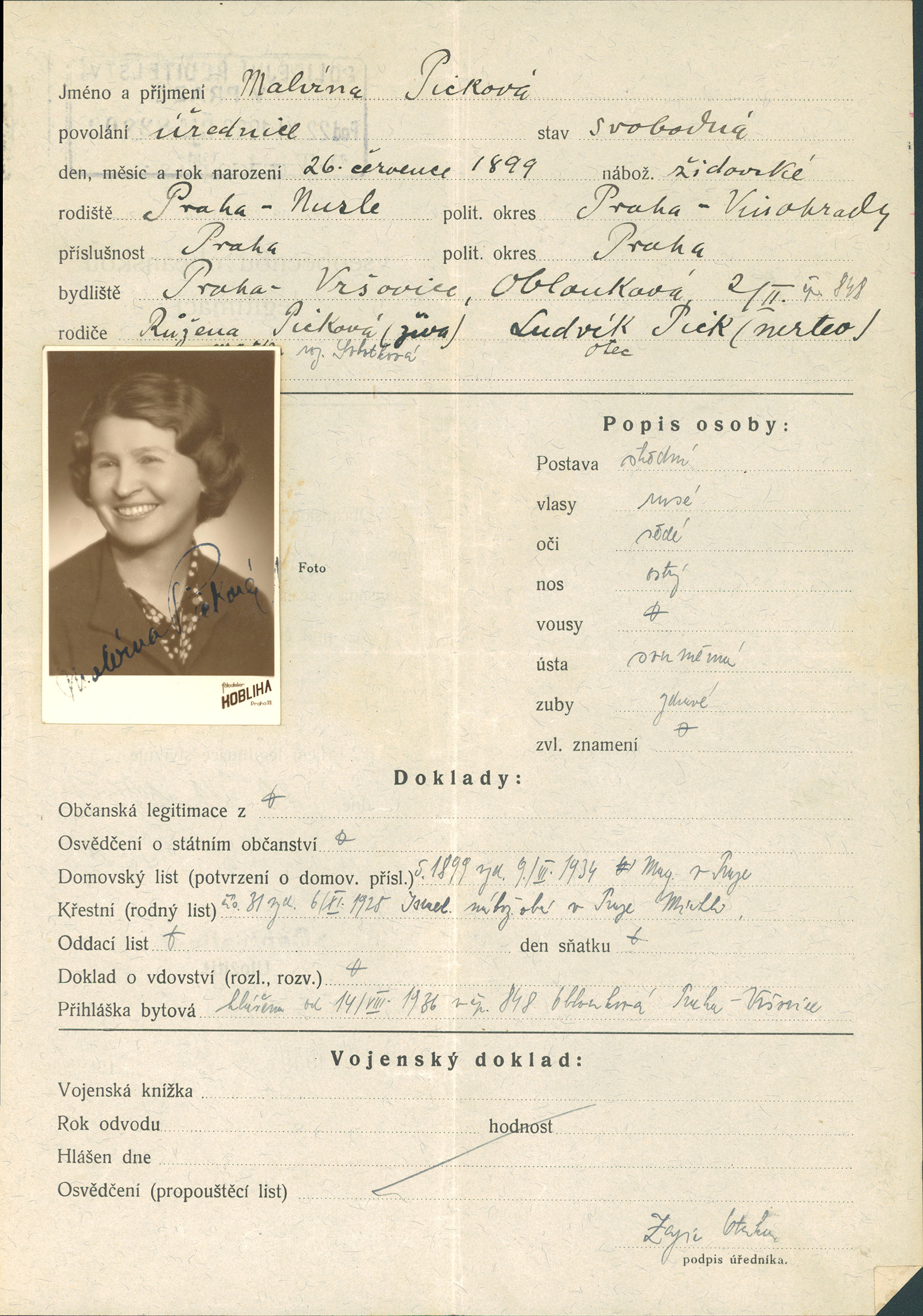 Picková Malvína: Žádost o vydání občanské legitimace