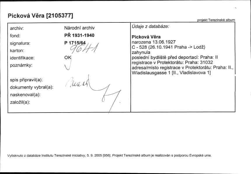 This database contains the names and fates of those who were deported from the territory of today’s Czech Republic, be it their homeland or may they have been deported to the Theresienstadt ghetto before from different european countries. Further, it contains basic information on those men, women and children, most of whom were Roma or Sinti, who died as prisoners of the so-called „Gypsy camp I“ Lety u Písku.
