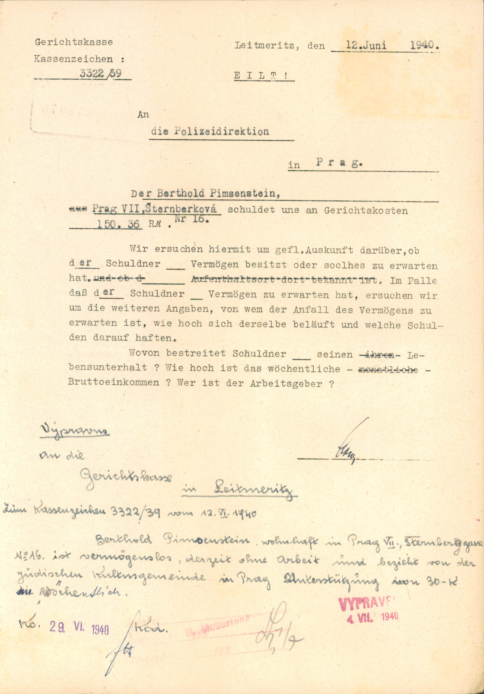 Pimsenstein Bertold: Šetření o majetkových poměrech