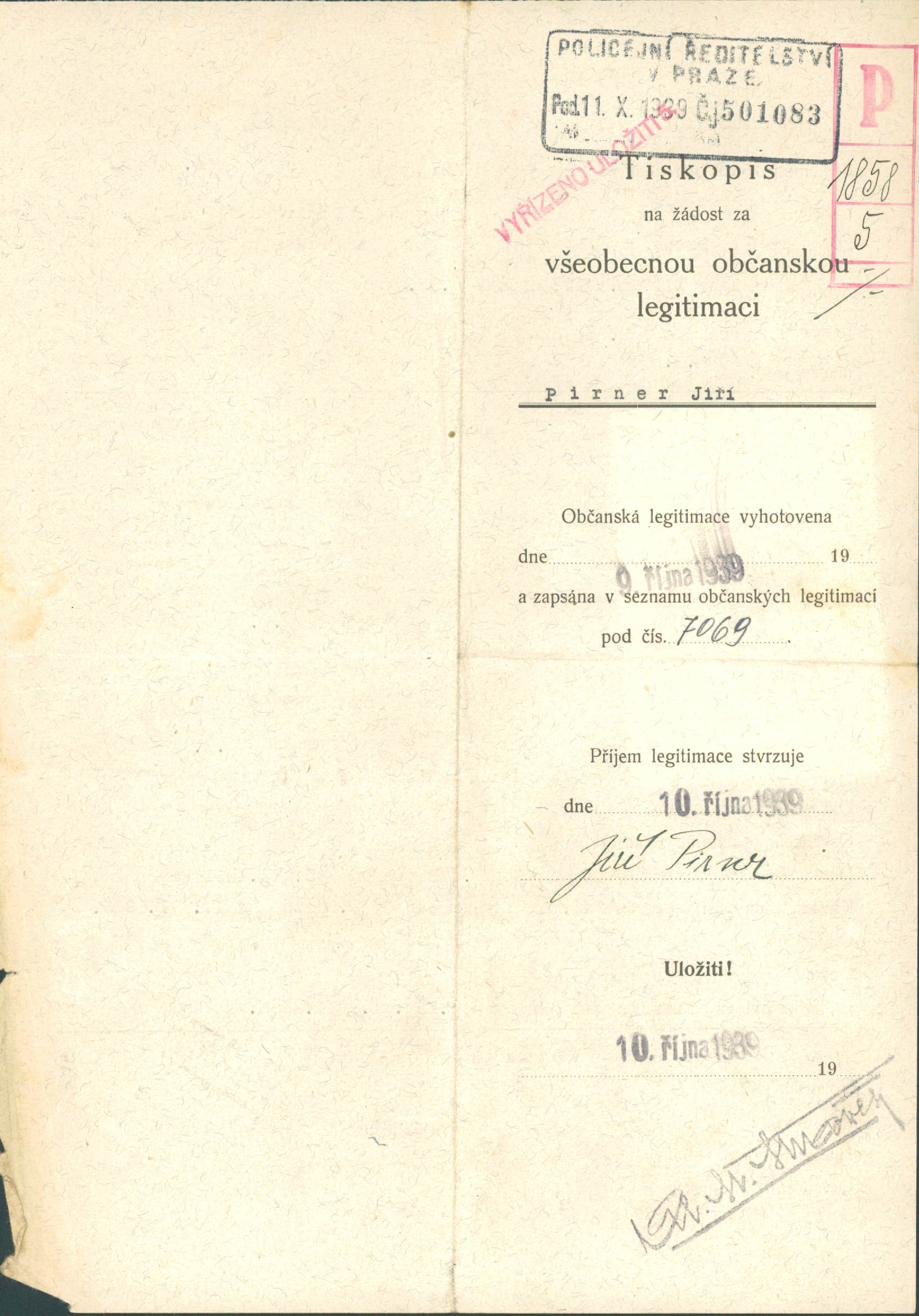Pirner Jiří: Žádost o vydání občanské legitimace