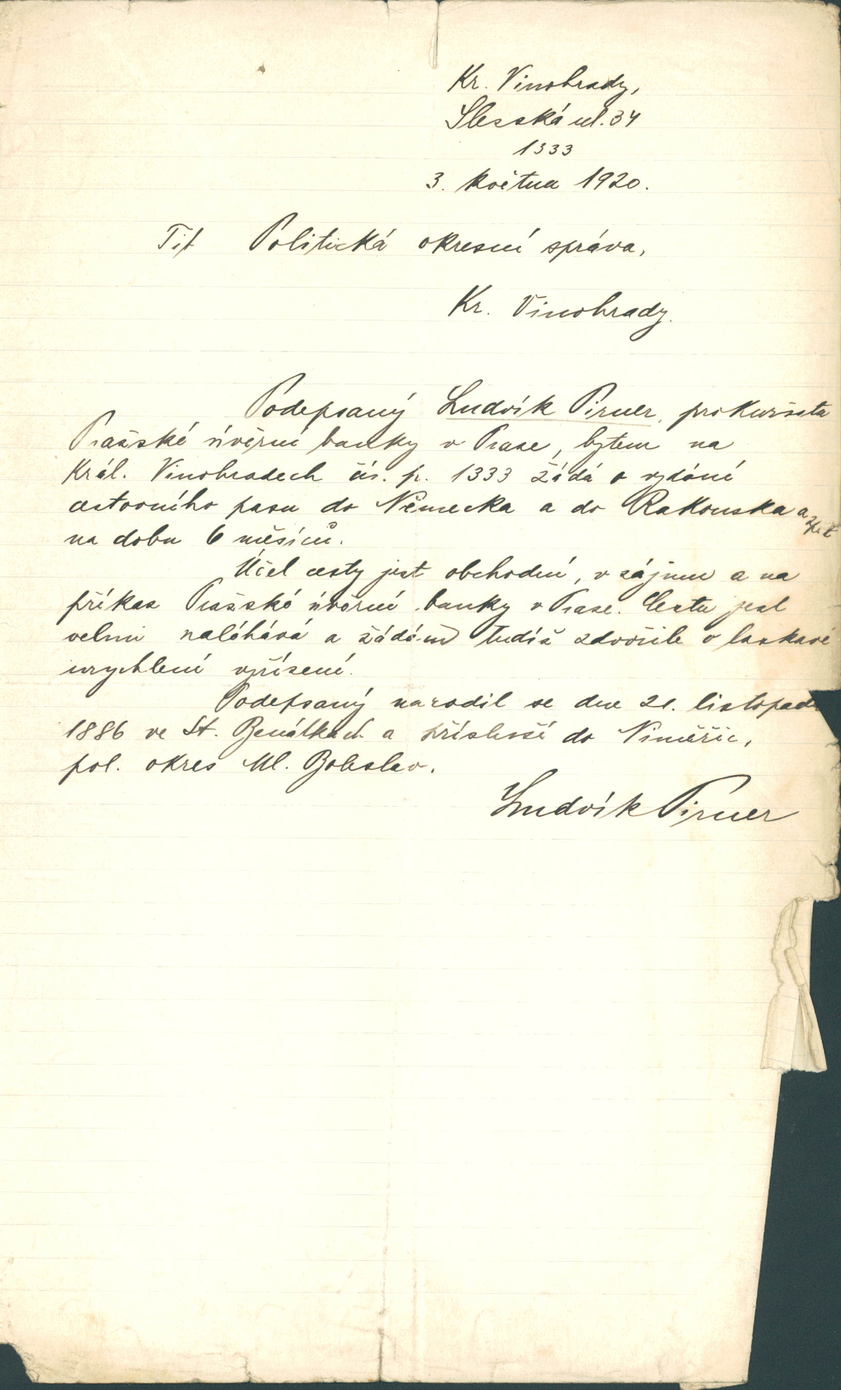 Pirner Ludvík: Žádost o vydání cestovního pasu