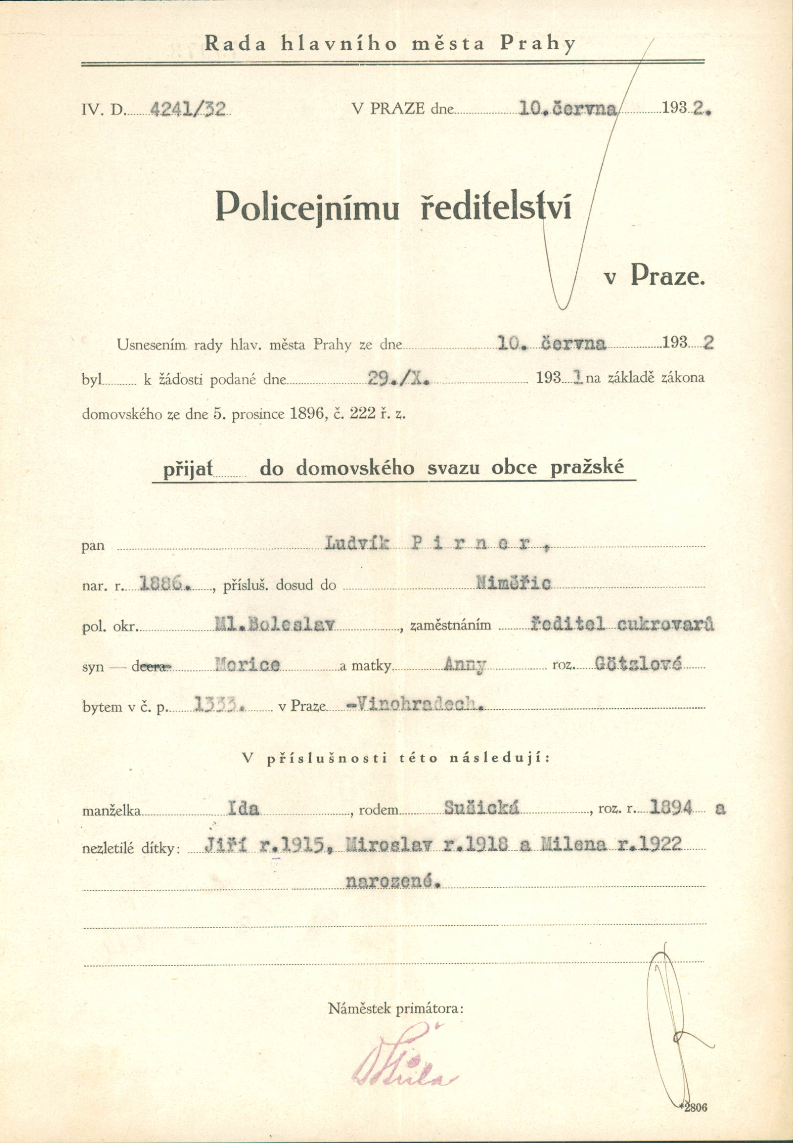 Pirner Ludvík: Nabytí domovského práva