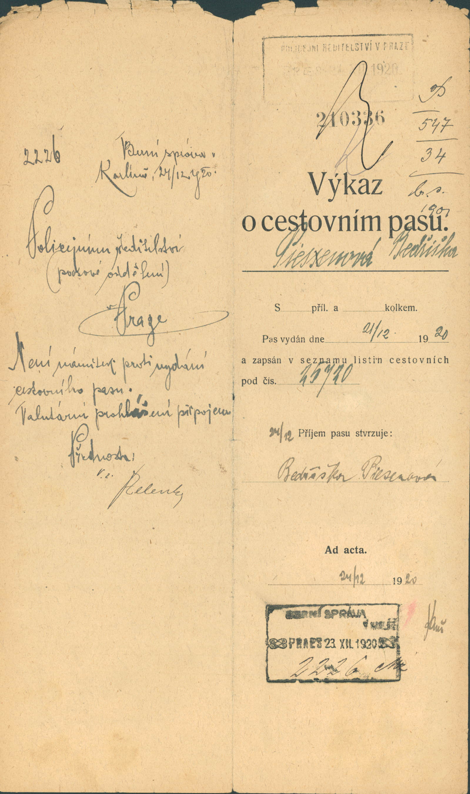 Piesenová Bedřiška: Žádost o vydání cestovního pasu