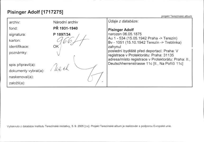 This database contains the names and fates of those who were deported from the territory of today’s Czech Republic, be it their homeland or may they have been deported to the Theresienstadt ghetto before from different european countries. Further, it contains basic information on those men, women and children, most of whom were Roma or Sinti, who died as prisoners of the so-called „Gypsy camp I“ Lety u Písku.