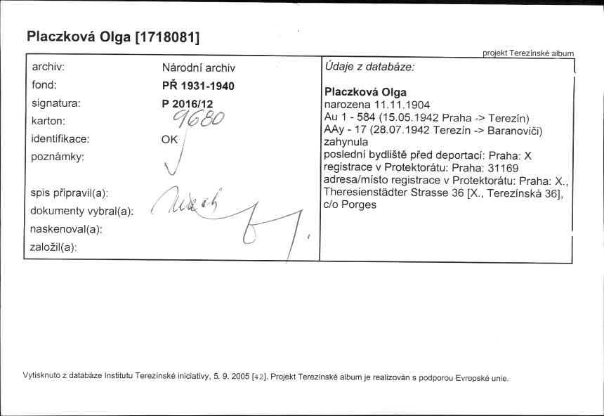 This database contains the names and fates of those who were deported from the territory of today’s Czech Republic, be it their homeland or may they have been deported to the Theresienstadt ghetto before from different european countries. Further, it contains basic information on those men, women and children, most of whom were Roma or Sinti, who died as prisoners of the so-called „Gypsy camp I“ Lety u Písku.