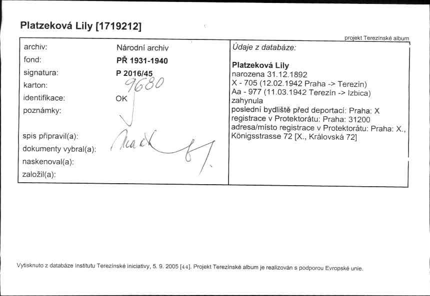 This database contains the names and fates of those who were deported from the territory of today’s Czech Republic, be it their homeland or may they have been deported to the Theresienstadt ghetto before from different european countries. Further, it contains basic information on those men, women and children, most of whom were Roma or Sinti, who died as prisoners of the so-called „Gypsy camp I“ Lety u Písku.