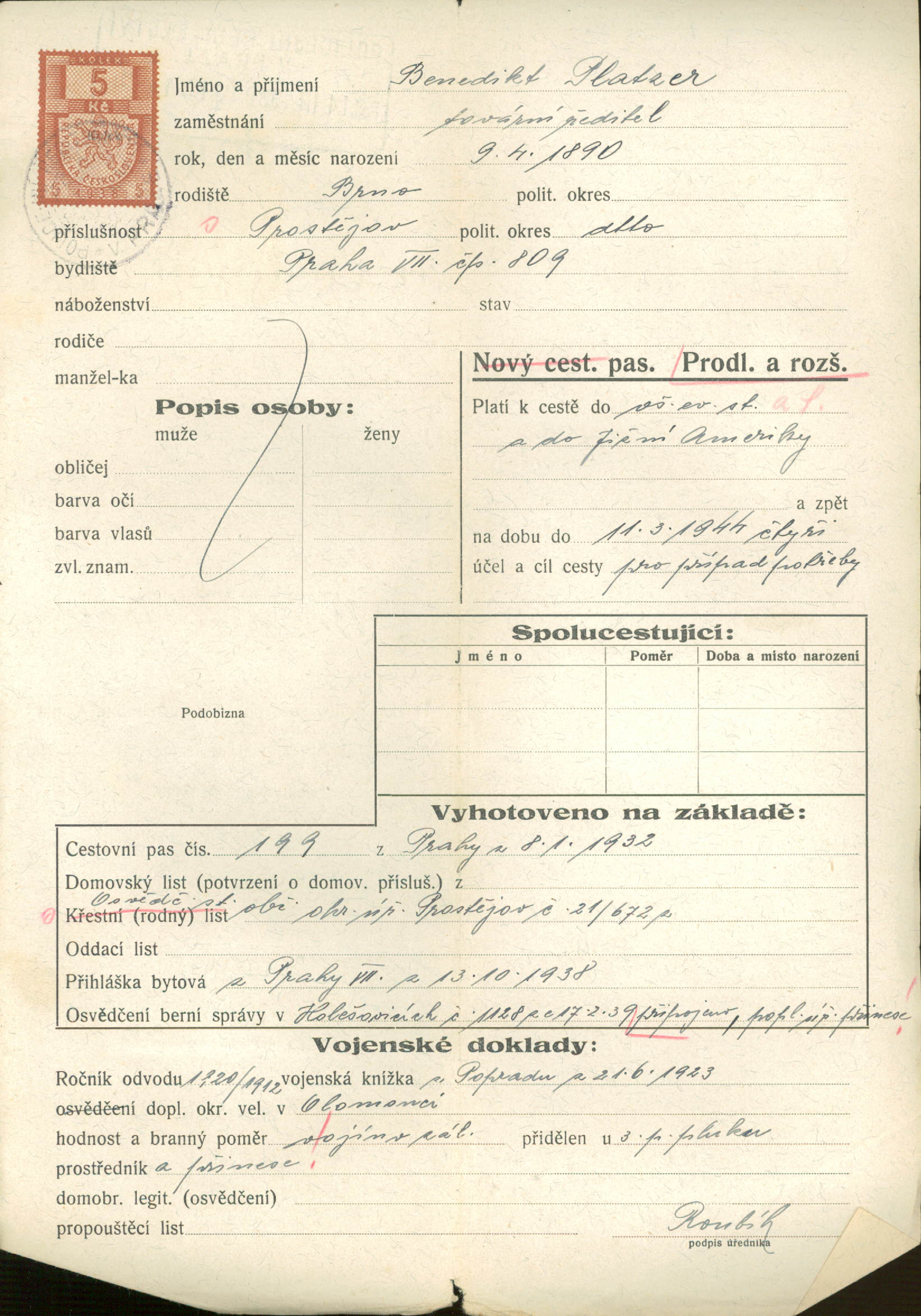 Platzer Benedikt: Žádost o prodloužení a rozšíření cestovního pasu