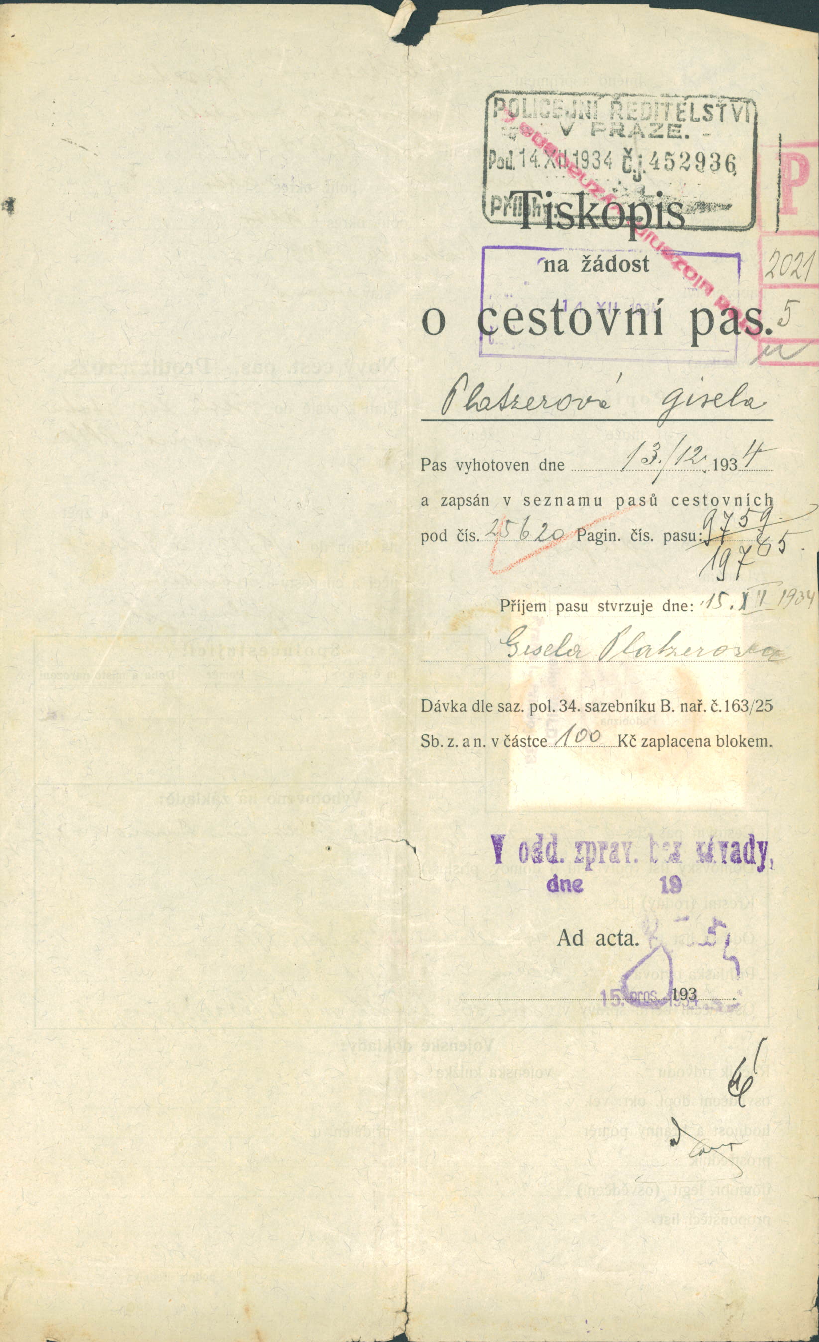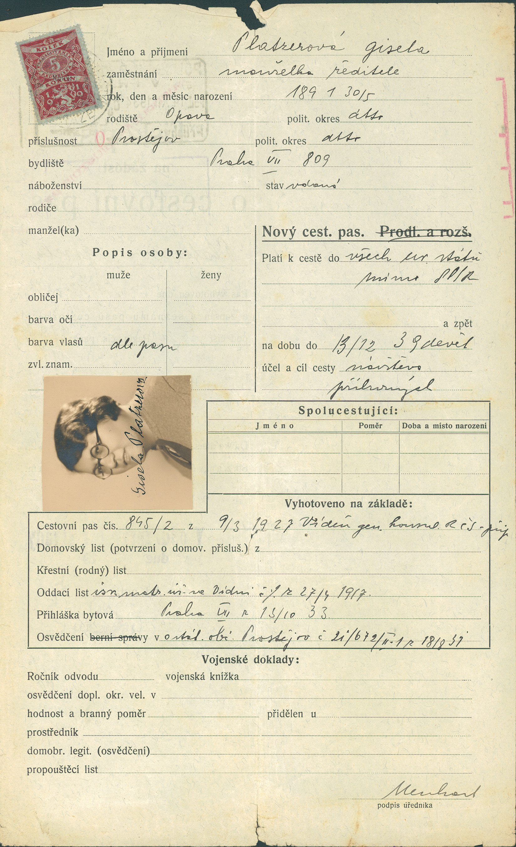 Platzerová Gizela: Žádost o vydání cestovního pasu