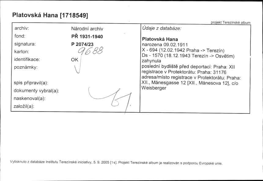 This database contains the names and fates of those who were deported from the territory of today’s Czech Republic, be it their homeland or may they have been deported to the Theresienstadt ghetto before from different european countries. Further, it contains basic information on those men, women and children, most of whom were Roma or Sinti, who died as prisoners of the so-called „Gypsy camp I“ Lety u Písku.
