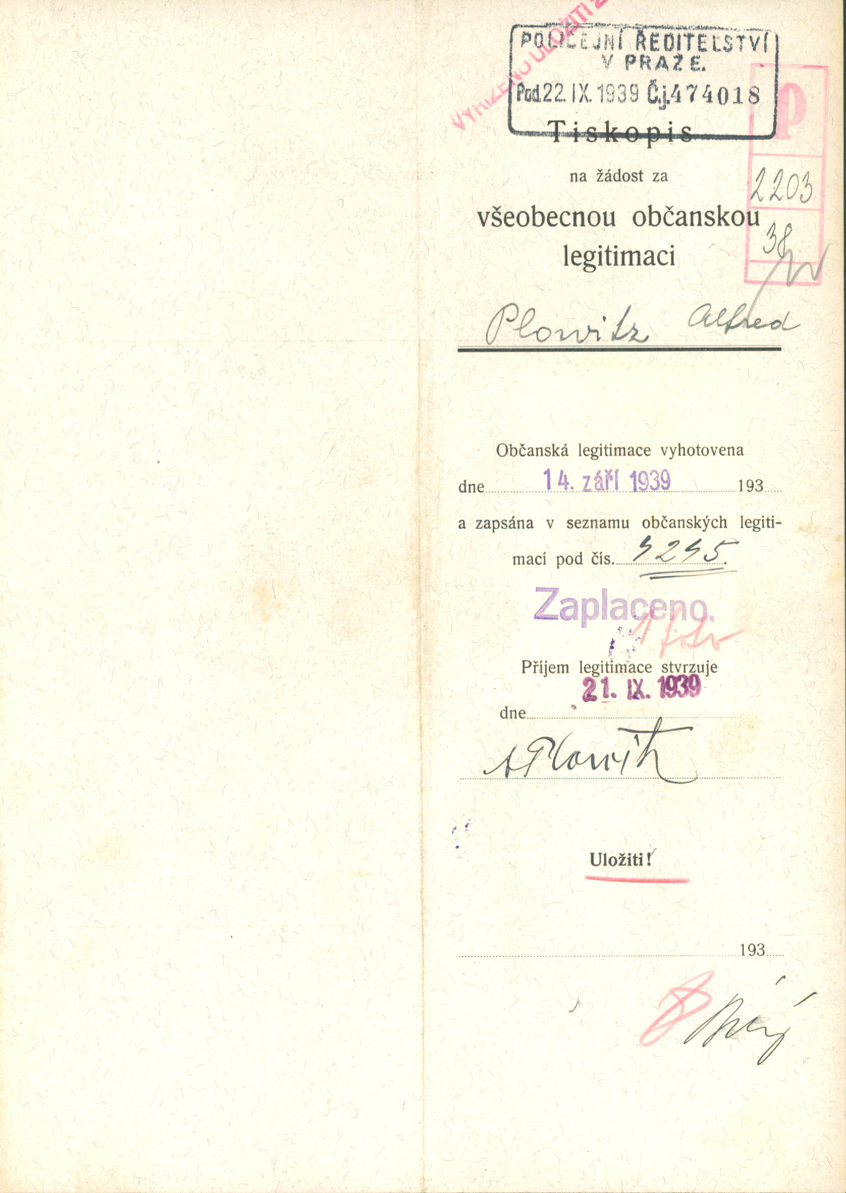Plowitz Alfred: Žádost o vydání občanské legitimace