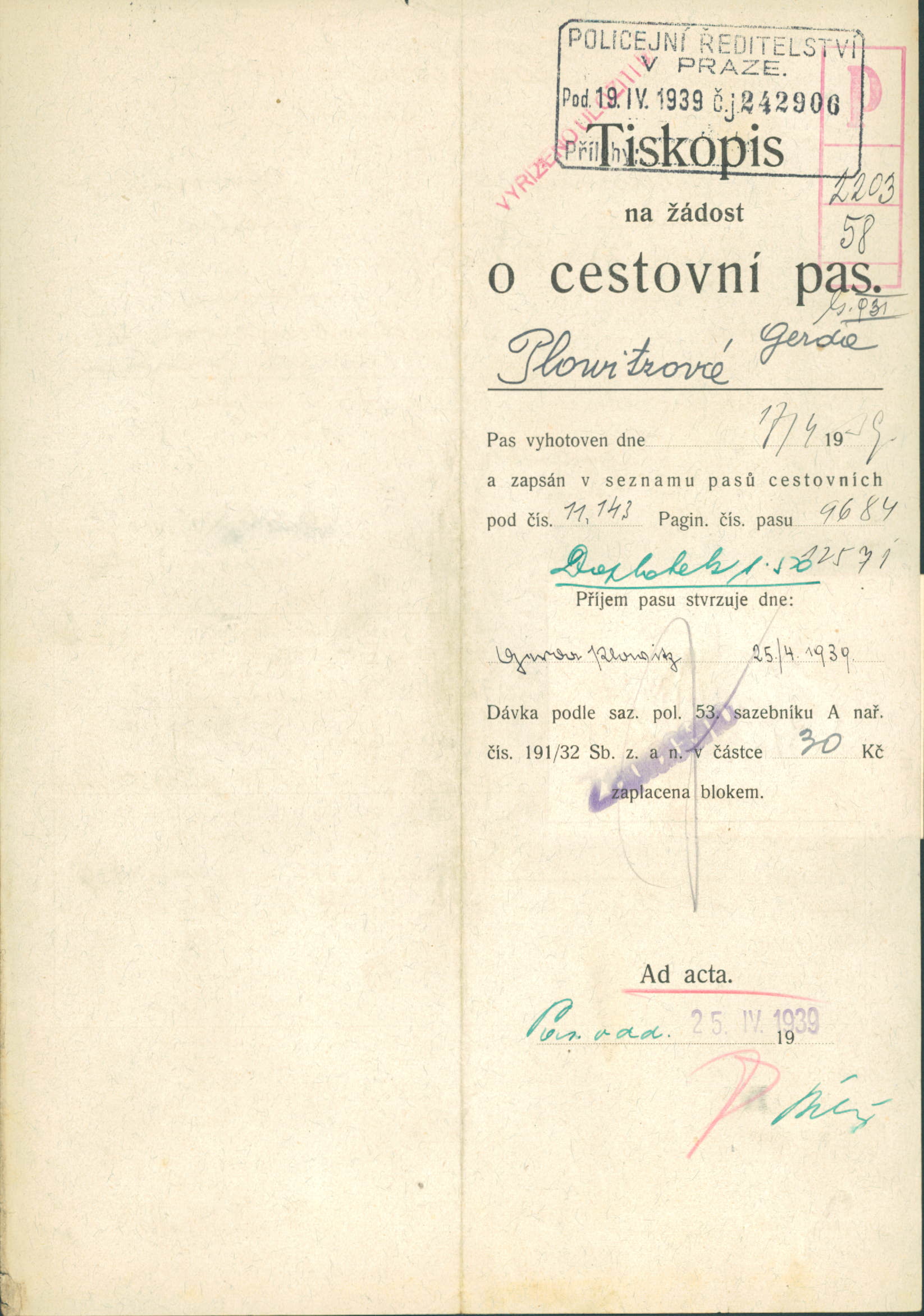 Plowitzová Gerda: Žádost o vydání cestovního pasu