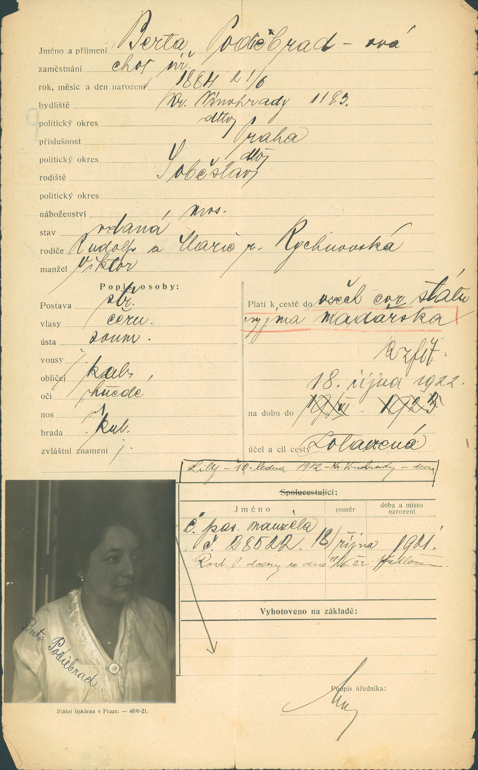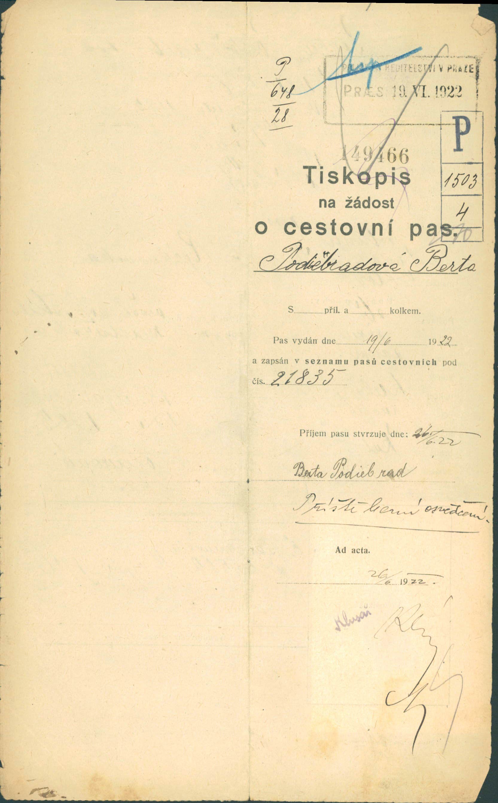 Podiebradová Berta: Žádost o vydání cestovního pasu