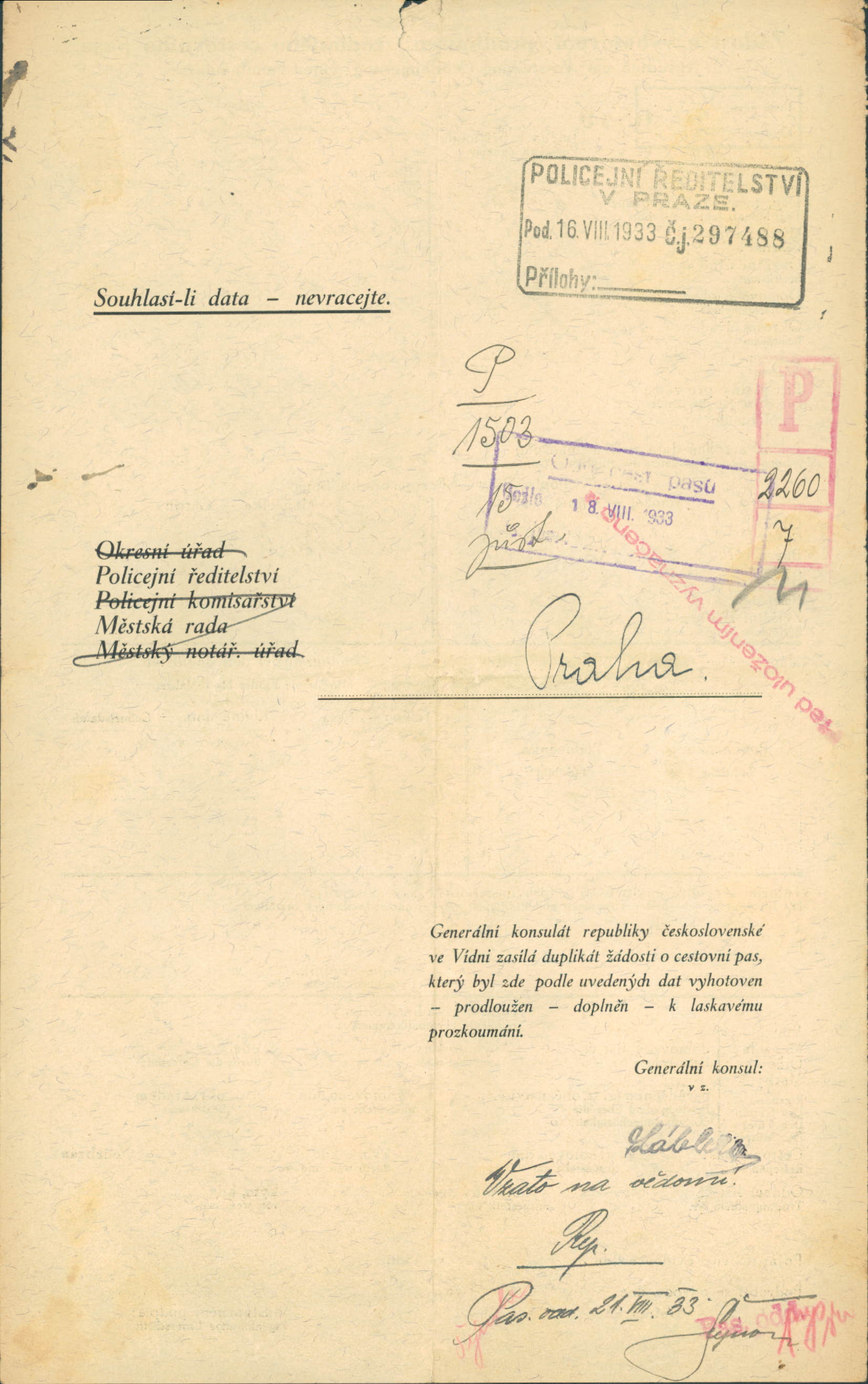 Podiebradová Žofie: Žádost o vydání a připsání dítěte do cestovního pasu