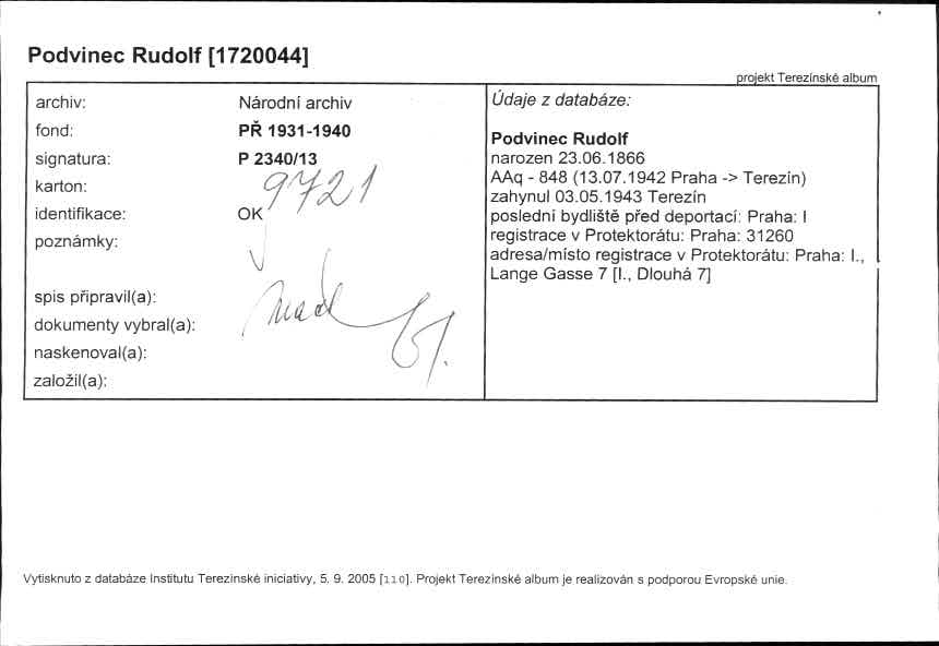 This database contains the names and fates of those who were deported from the territory of today’s Czech Republic, be it their homeland or may they have been deported to the Theresienstadt ghetto before from different european countries. Further, it contains basic information on those men, women and children, most of whom were Roma or Sinti, who died as prisoners of the so-called „Gypsy camp I“ Lety u Písku.