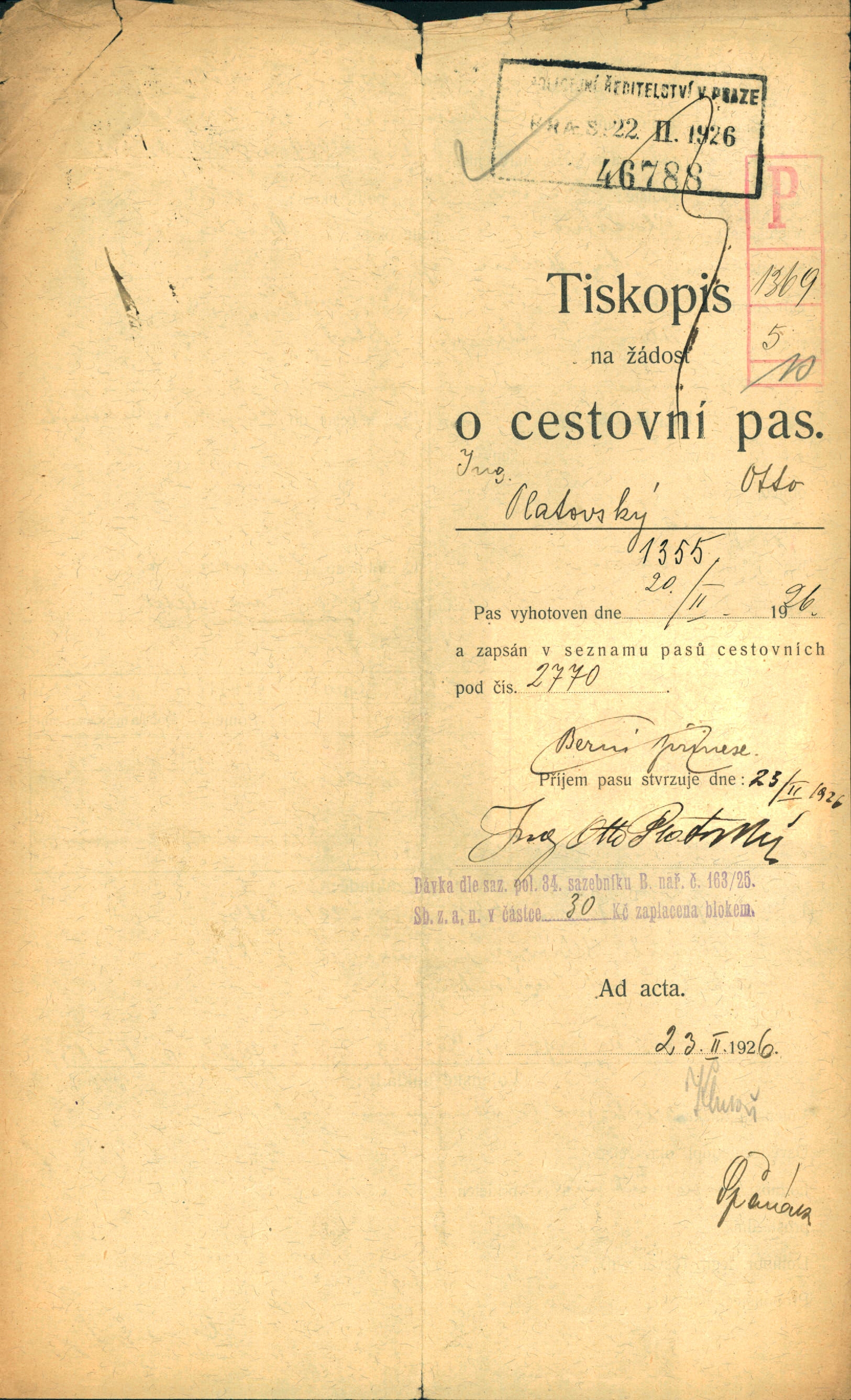 Platovský Otto: Žádost o vydání cestovního pasu
