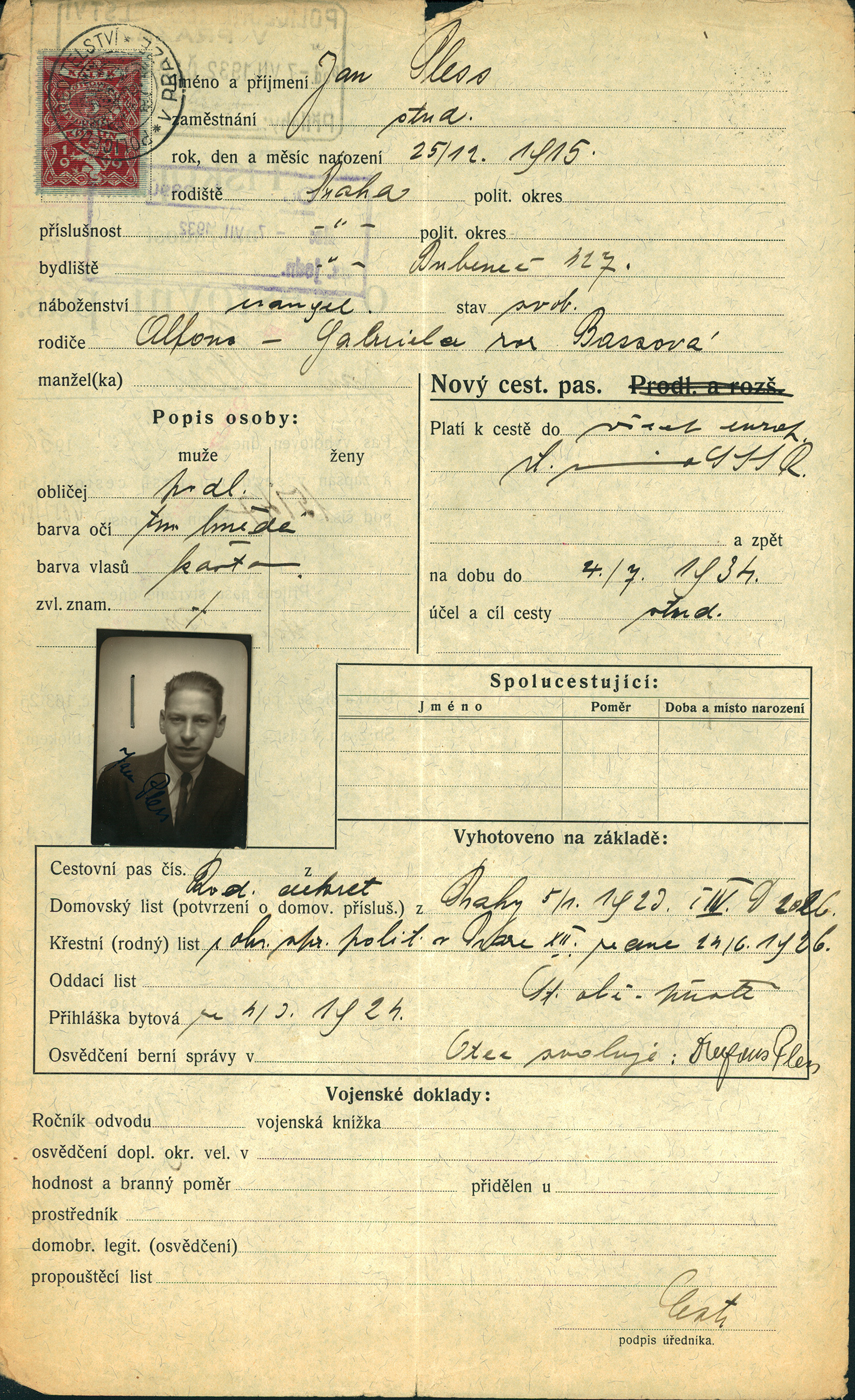 Pless Jan: Žádost o vydání cestovního pasu