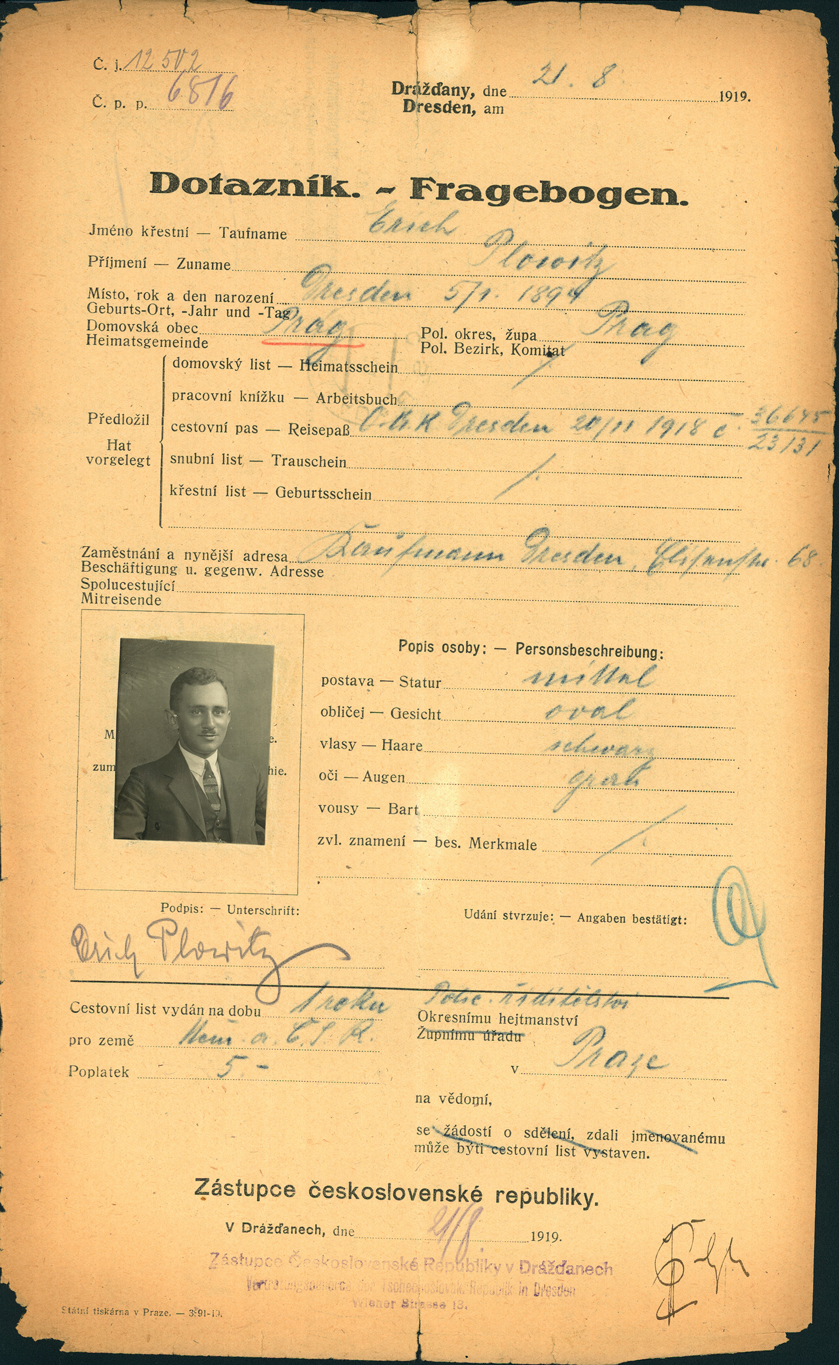 Plowitz Erich: Žádost o vydání cestovního pasu