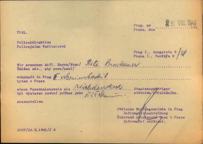 National archives Prague > Police Directorate Prague > 1941-1950 > P > Proskauerová Rita
