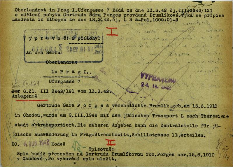 Brumlíková Gerta: Šetření o pobytu odtransportovaných Židů