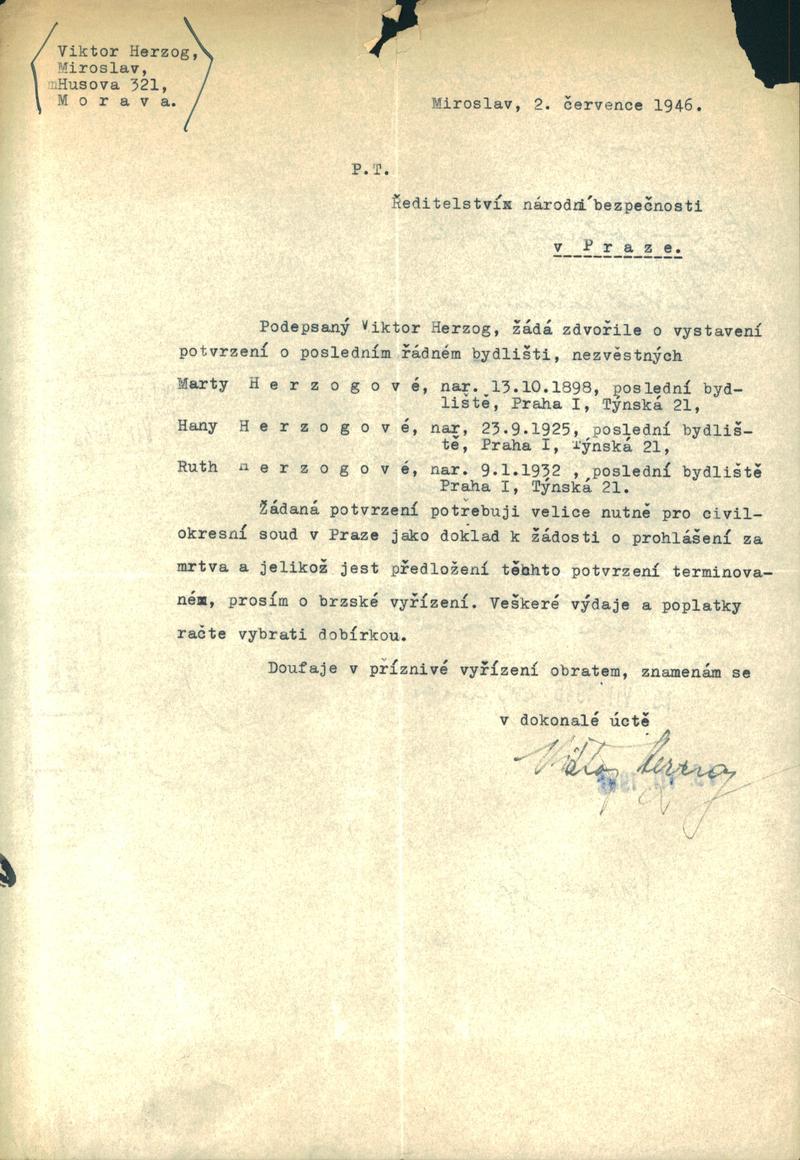 Herzogová Marta: Žádost o potvrzení posledního pobytu nezvěstných