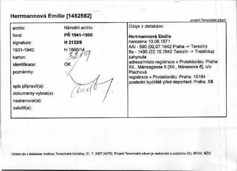 For publication purposes, contact the National Archives in Prague, where the original document is located. The document was digitized by the Terezín Initiative Institute, the Terezín Album project