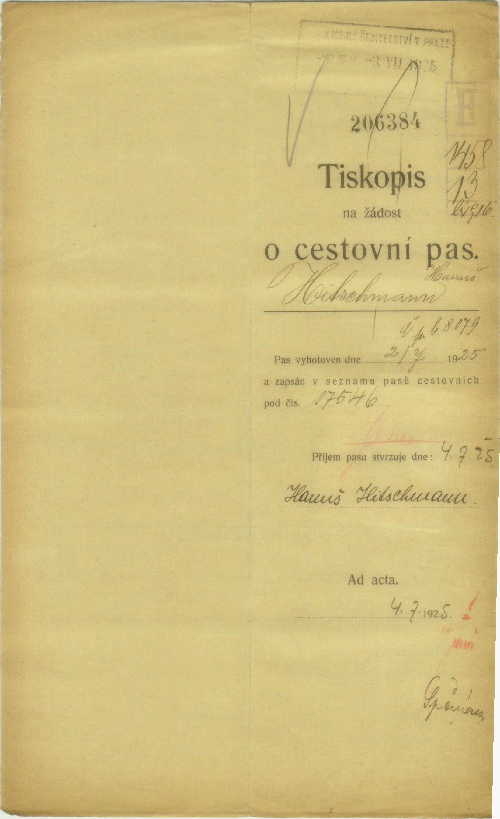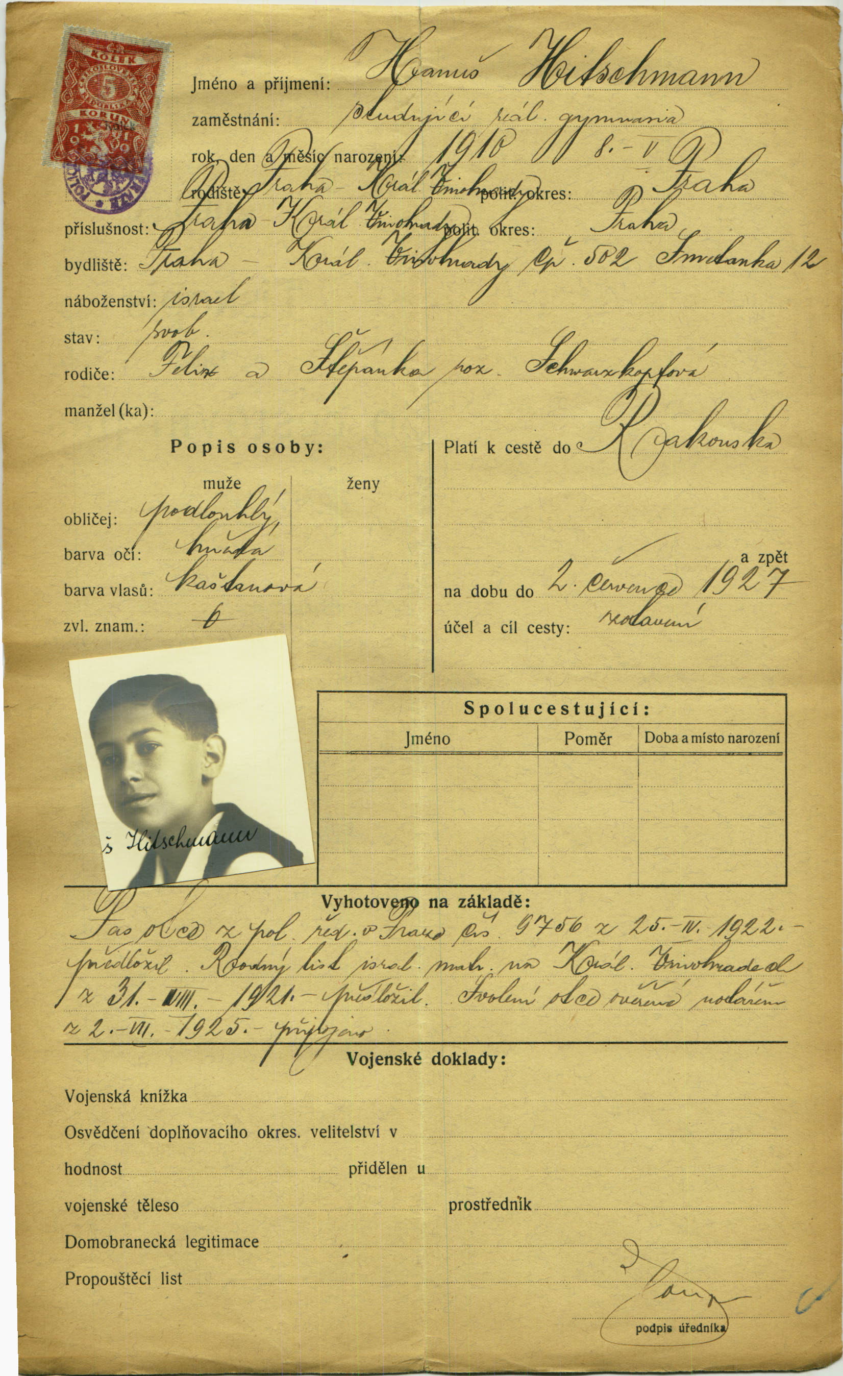 Hitschmann Hanuš: Žádost o vydání cestovního pasu