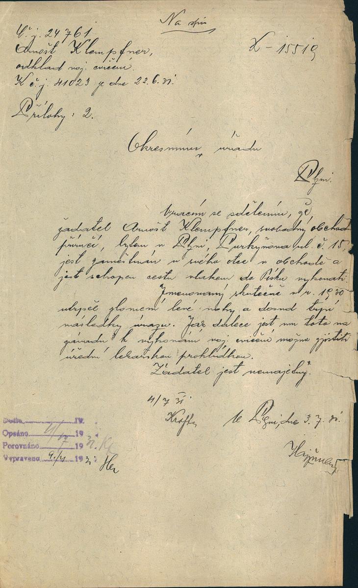 State Regional Archives in Pilsen > Police Directorate Pilsen > 1918-1951 > K > Klempfner Arnošt