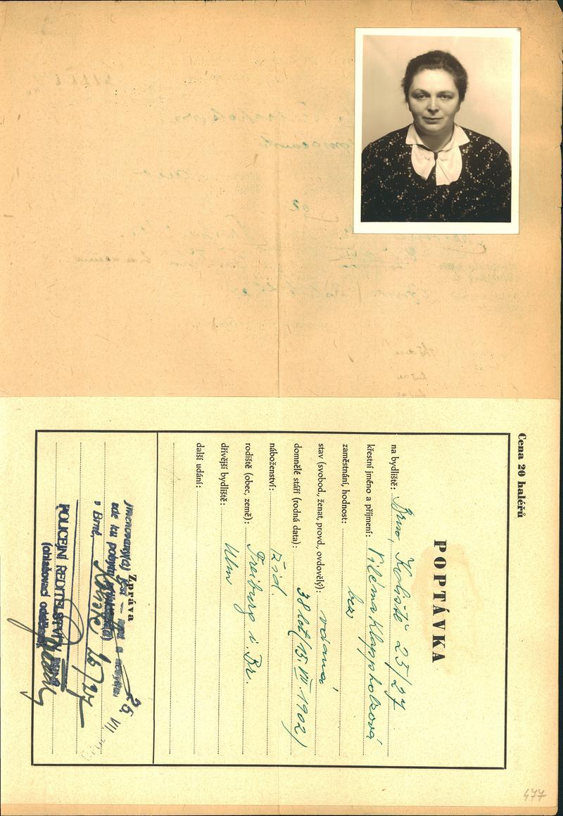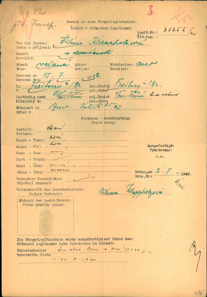 Moravský zemský archiv Brno > Policejní ředitelství Brno > Žádosti židovských občanů určených k transportu o občanské legitimace > Klappholzová Viléma