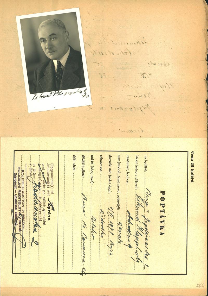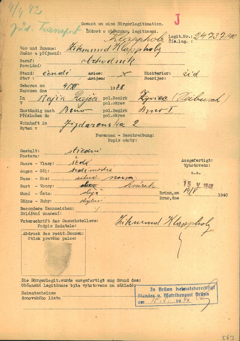 Moravský zemský archiv Brno > Policejní ředitelství Brno > Žádosti židovských občanů určených k transportu o občanské legitimace > Klappholz Zikmund