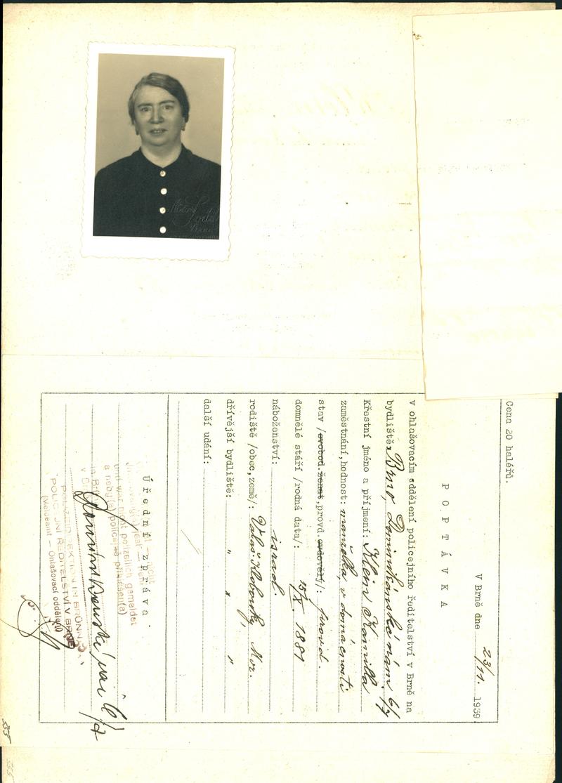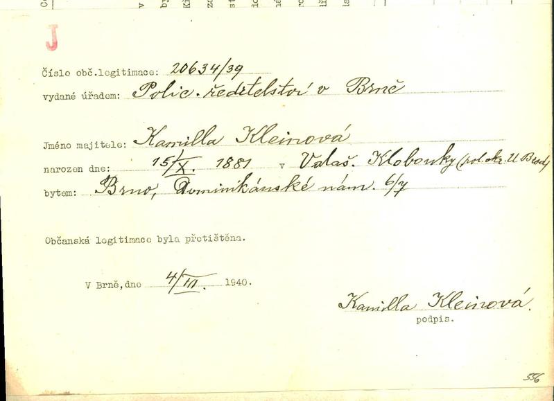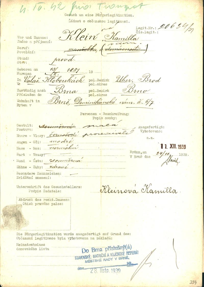 Moravský zemský archiv Brno > Policejní ředitelství Brno > Žádosti židovských občanů určených k transportu o občanské legitimace > Kleinová Kamila