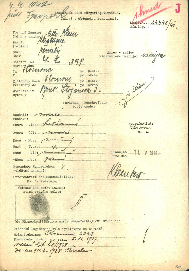 Moravský zemský archiv Brno > Policejní ředitelství Brno > Žádosti židovských občanů určených k transportu o občanské legitimace > Klein Otto