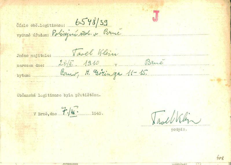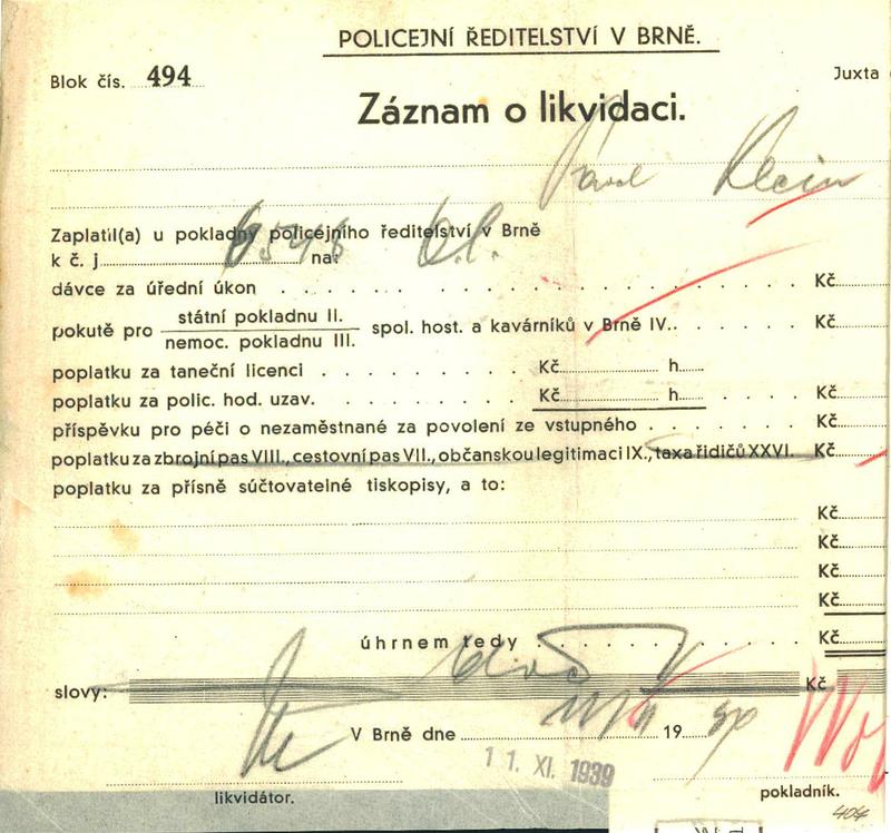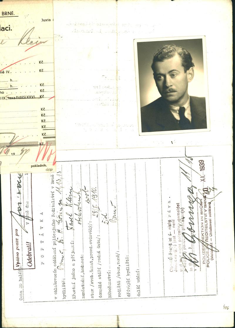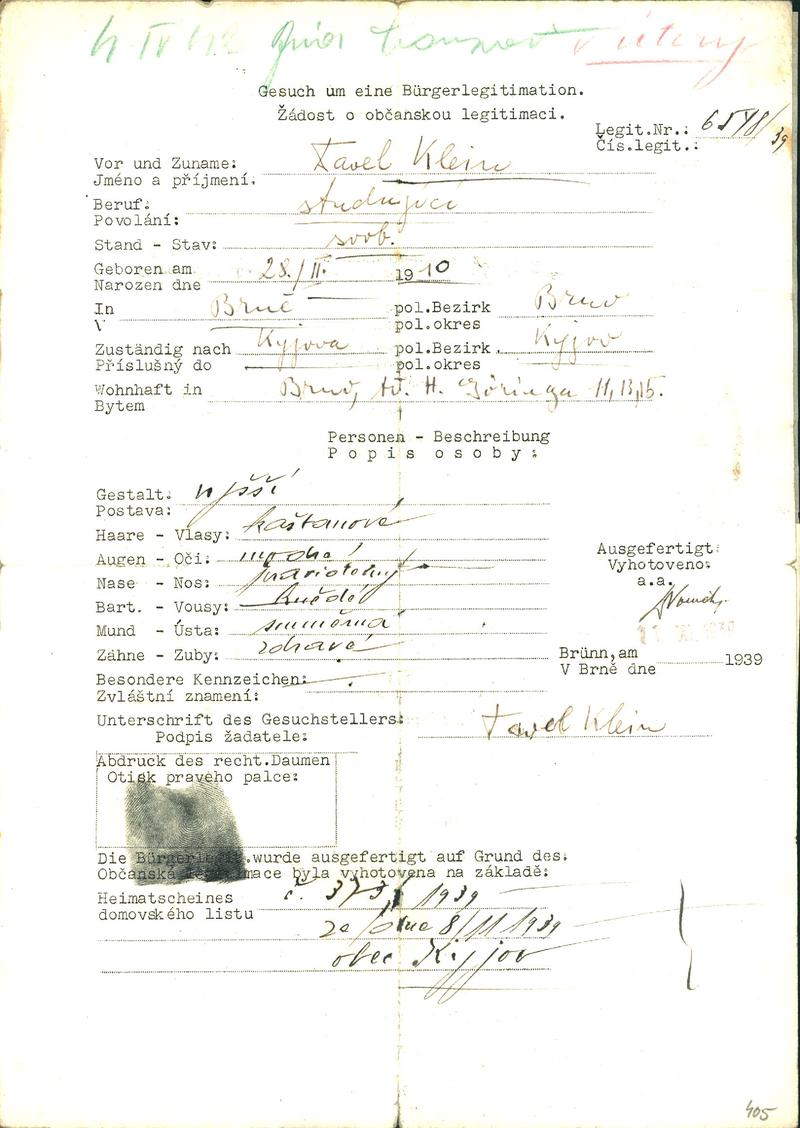 Moravský zemský archiv Brno > Policejní ředitelství Brno > Žádosti židovských občanů určených k transportu o občanské legitimace > Klein Pavel