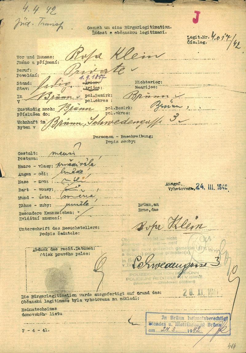 Moravský zemský archiv Brno > Policejní ředitelství Brno > Žádosti židovských občanů určených k transportu o občanské legitimace > Kleinová Růžena