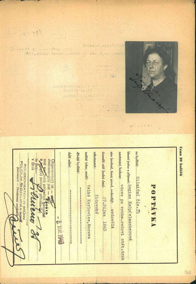 Moravský zemský archiv Brno > Policejní ředitelství Brno > Žádosti židovských občanů určených k transportu o občanské legitimace > Knöpfelmacherová Regina