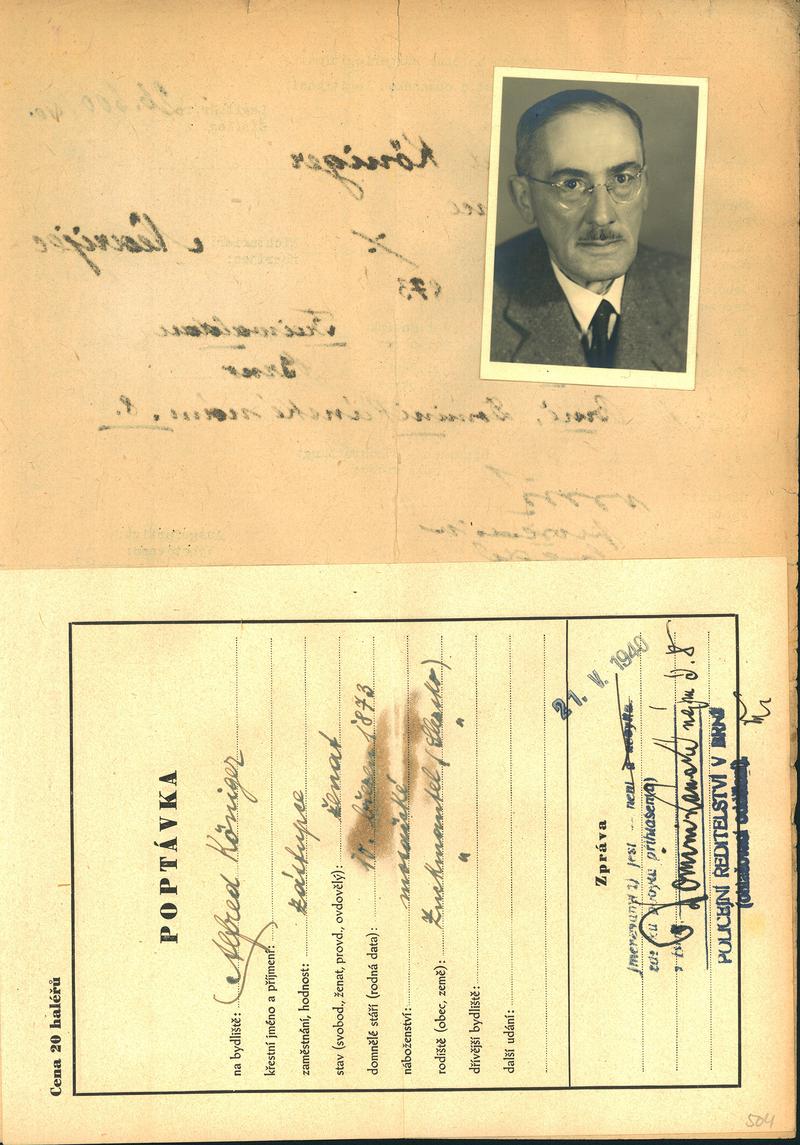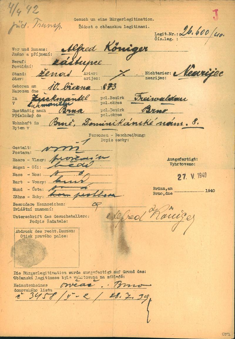 Moravský zemský archiv Brno > Policejní ředitelství Brno > Žádosti židovských občanů určených k transportu o občanské legitimace > Königer Alfred