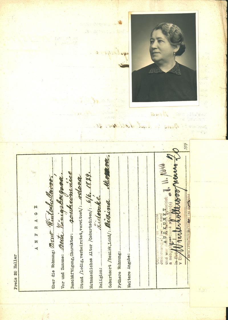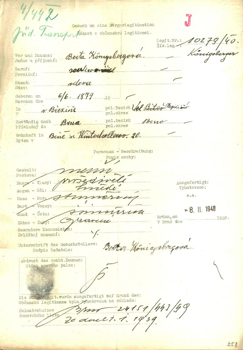 Moravský zemský archiv Brno > Policejní ředitelství Brno > Žádosti židovských občanů určených k transportu o občanské legitimace > Königsbergová Berta