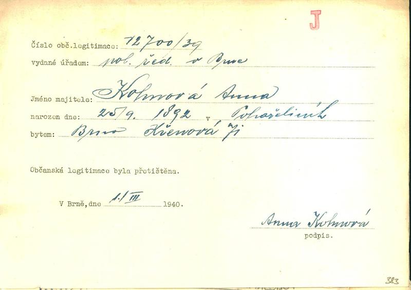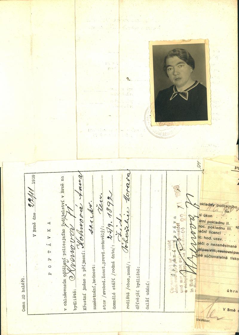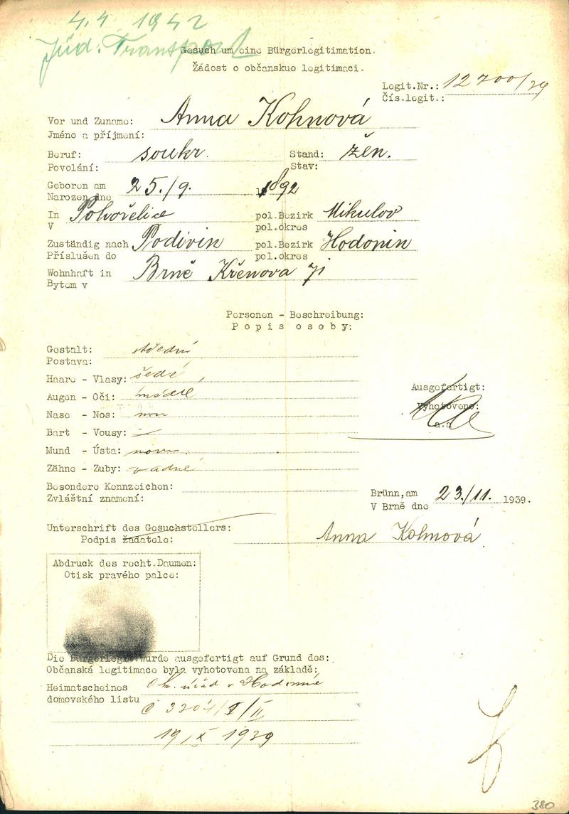 Moravský zemský archiv Brno > Policejní ředitelství Brno > Žádosti židovských občanů určených k transportu o občanské legitimace > Kohnová Anna