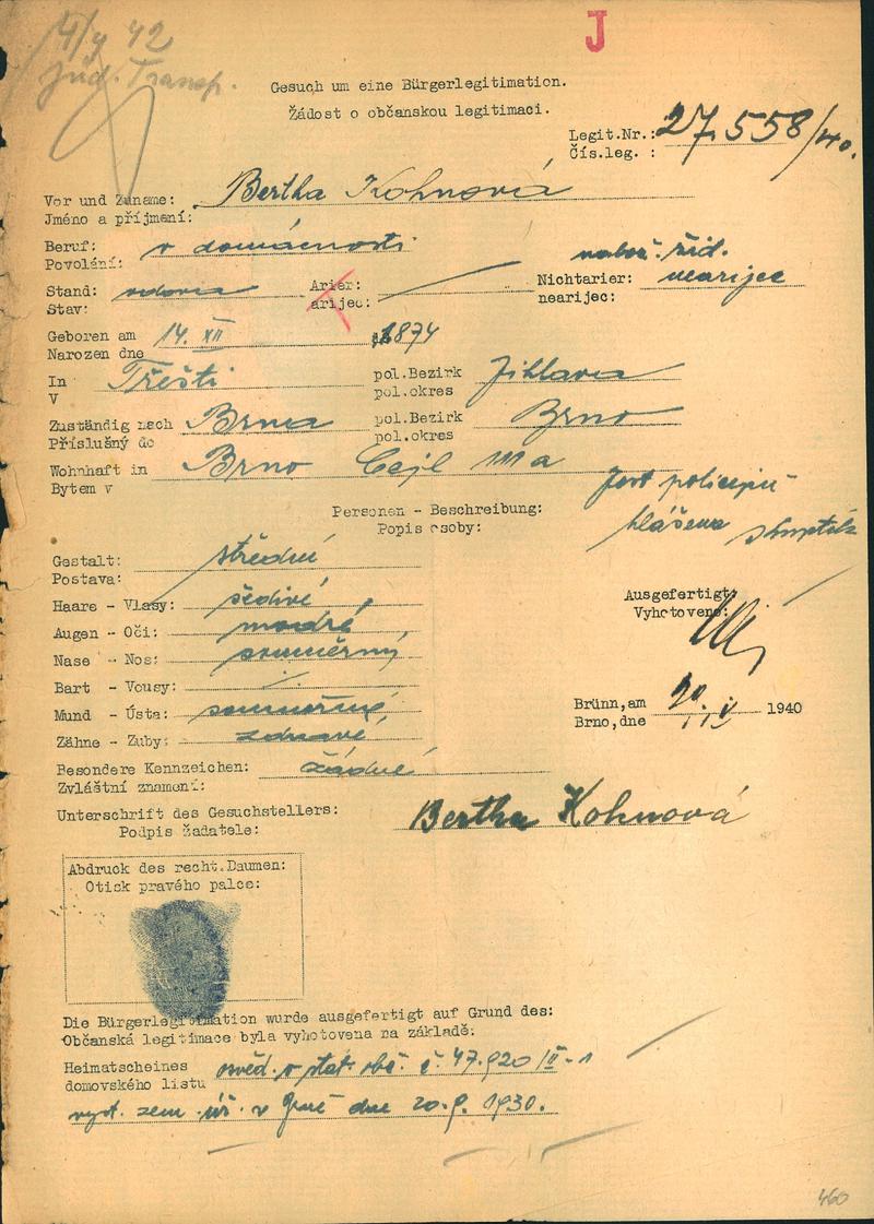 Moravský zemský archiv Brno > Policejní ředitelství Brno > Žádosti židovských občanů určených k transportu o občanské legitimace > Kohnová Berta