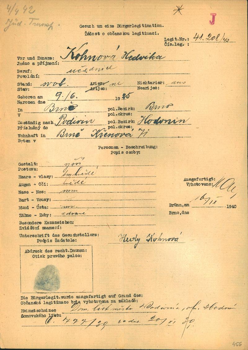 Moravský zemský archiv Brno > Policejní ředitelství Brno > Žádosti židovských občanů určených k transportu o občanské legitimace > Kohnová Hedvika