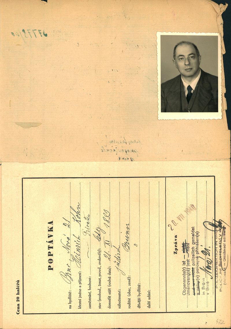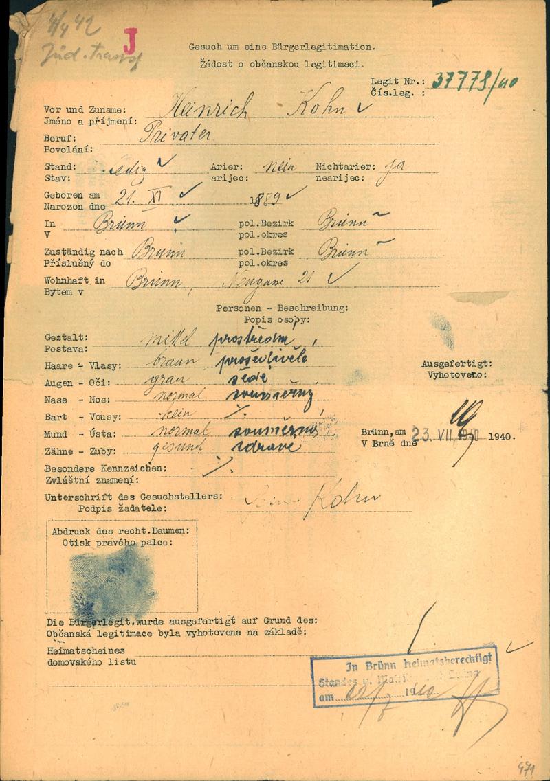 Moravský zemský archiv Brno > Policejní ředitelství Brno > Žádosti židovských občanů určených k transportu o občanské legitimace > Kohn Jindřich