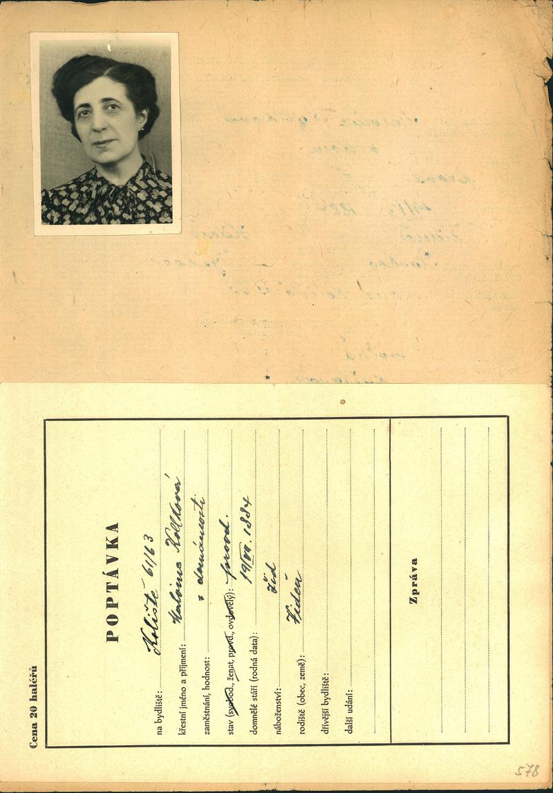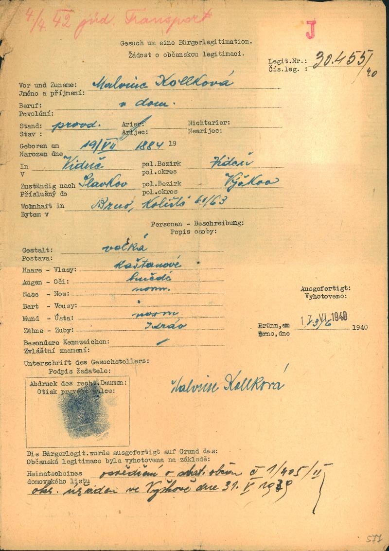 Moravský zemský archiv Brno > Policejní ředitelství Brno > Žádosti židovských občanů určených k transportu o občanské legitimace > Kolleková Malvína