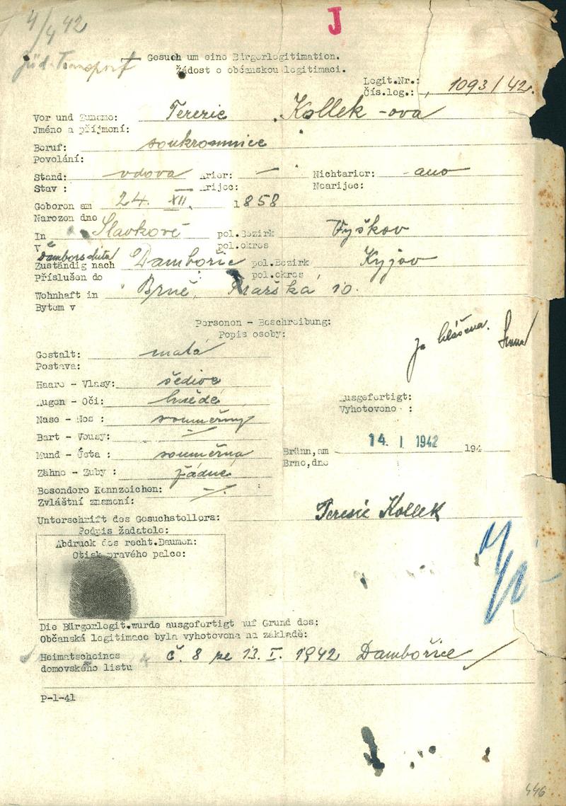 Moravský zemský archiv Brno > Policejní ředitelství Brno > Žádosti židovských občanů určených k transportu o občanské legitimace > Kolleková Terezie