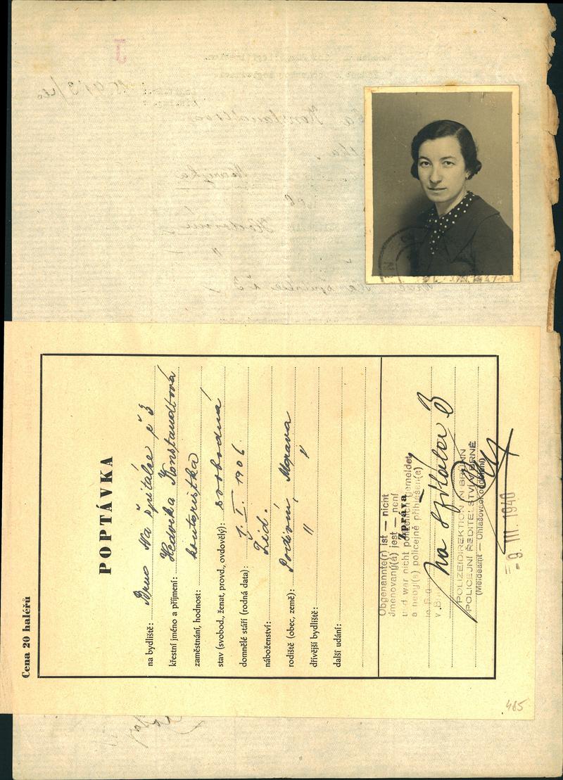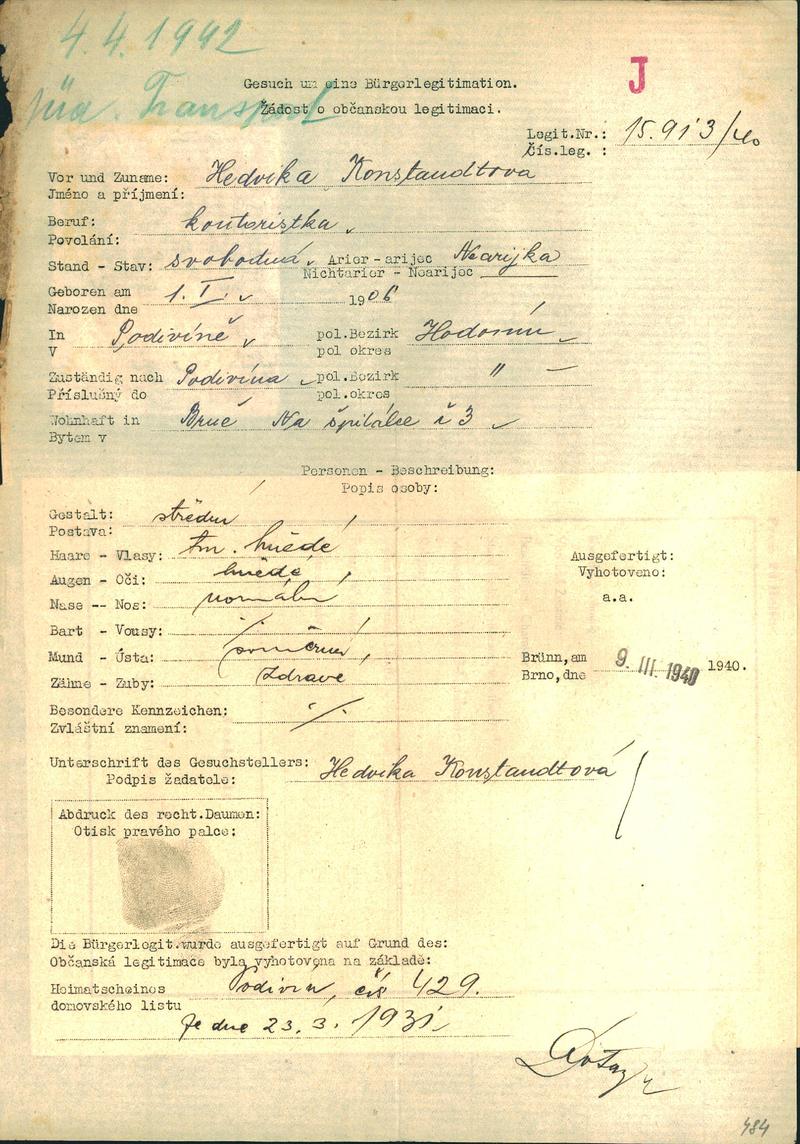 Moravský zemský archiv Brno > Policejní ředitelství Brno > Žádosti židovských občanů určených k transportu o občanské legitimace > Konstandtová Hedvika