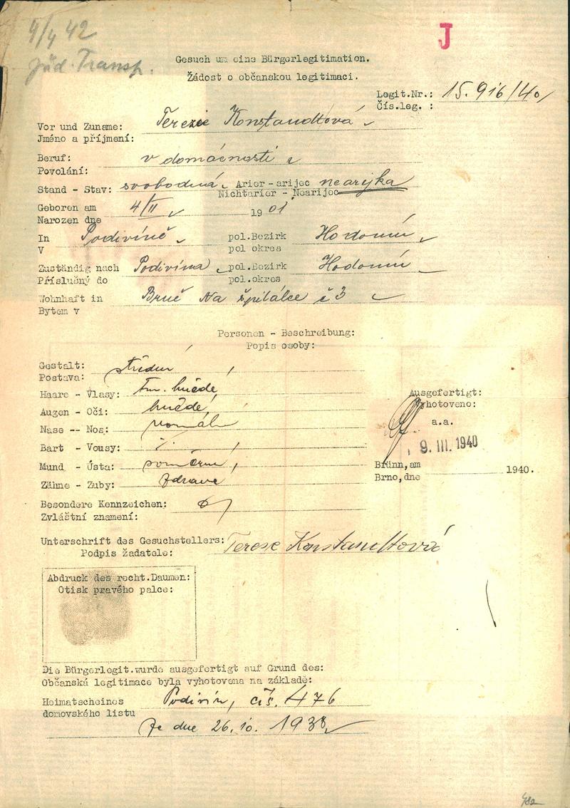 Moravský zemský archiv Brno > Policejní ředitelství Brno > Žádosti židovských občanů určených k transportu o občanské legitimace > Konstandtová Terezie